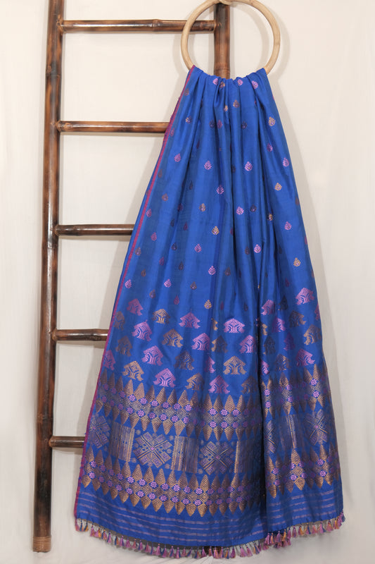 Expertly crafted with a blend of high-quality mulberry silk and cotton, this muga ghisa saree...