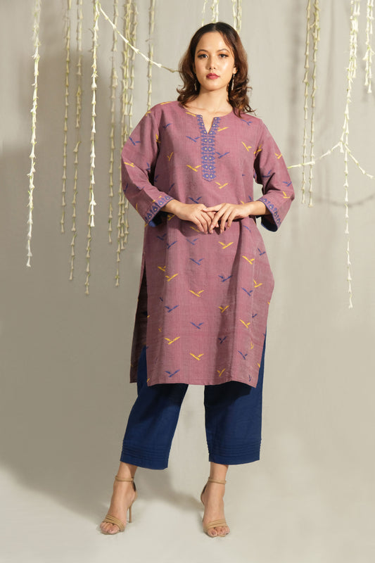 Expertly crafted with natural Eri Silk dye, this Kurta features intricate silk motifs. The Eri...