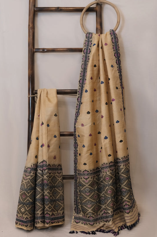 Mekhela Sador - Mulberry silk (nuni silk) motifs in Eri silk natural dye