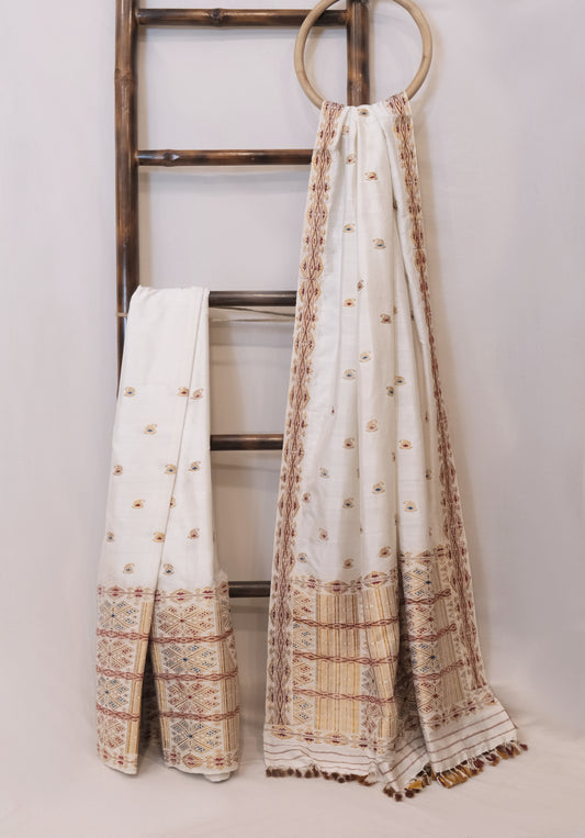 Mekhela Sador - Mulberry silk motifs in golden zari & eri silk natural dye