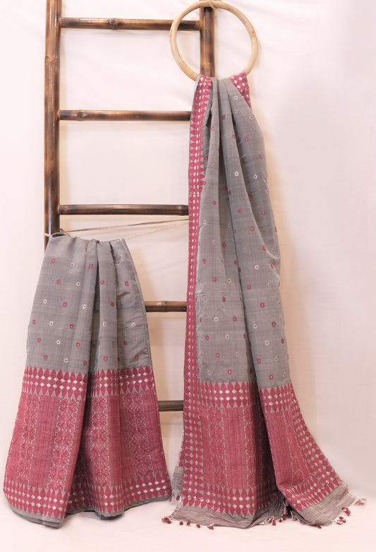Mekhela Sador - Mulberry silk motifs silver zari & Eri silk natural dye