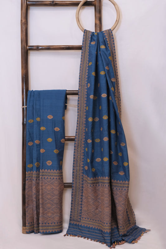 Mekhela Sador - Mulberry silk (nuni silk) motifs in Muga ghisa silk & Eri silk natural dye