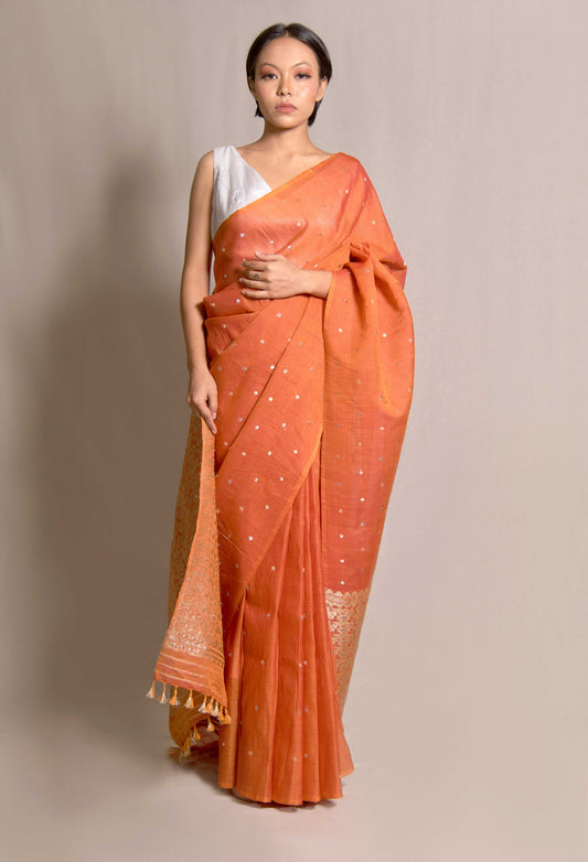 Experience the luxurious blend of Mulberry silk and cotton motifs in our Tassar silk saree....