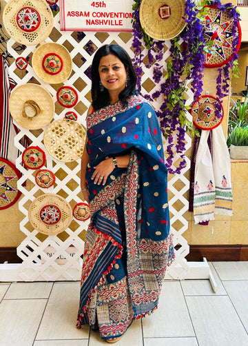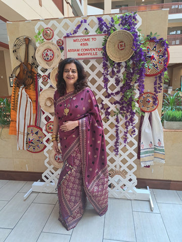 “Loved wearing my mekhela sador from Lahe Looms at the Assam Convention 2024 in Nashville, TN. This is a mulberry silk & cotton blend with ghisa muga work and naturally dyed. The mekhela sador drapes very well, very comfortable to wear and the colors looked vibrant. Received a lot of compliments.”