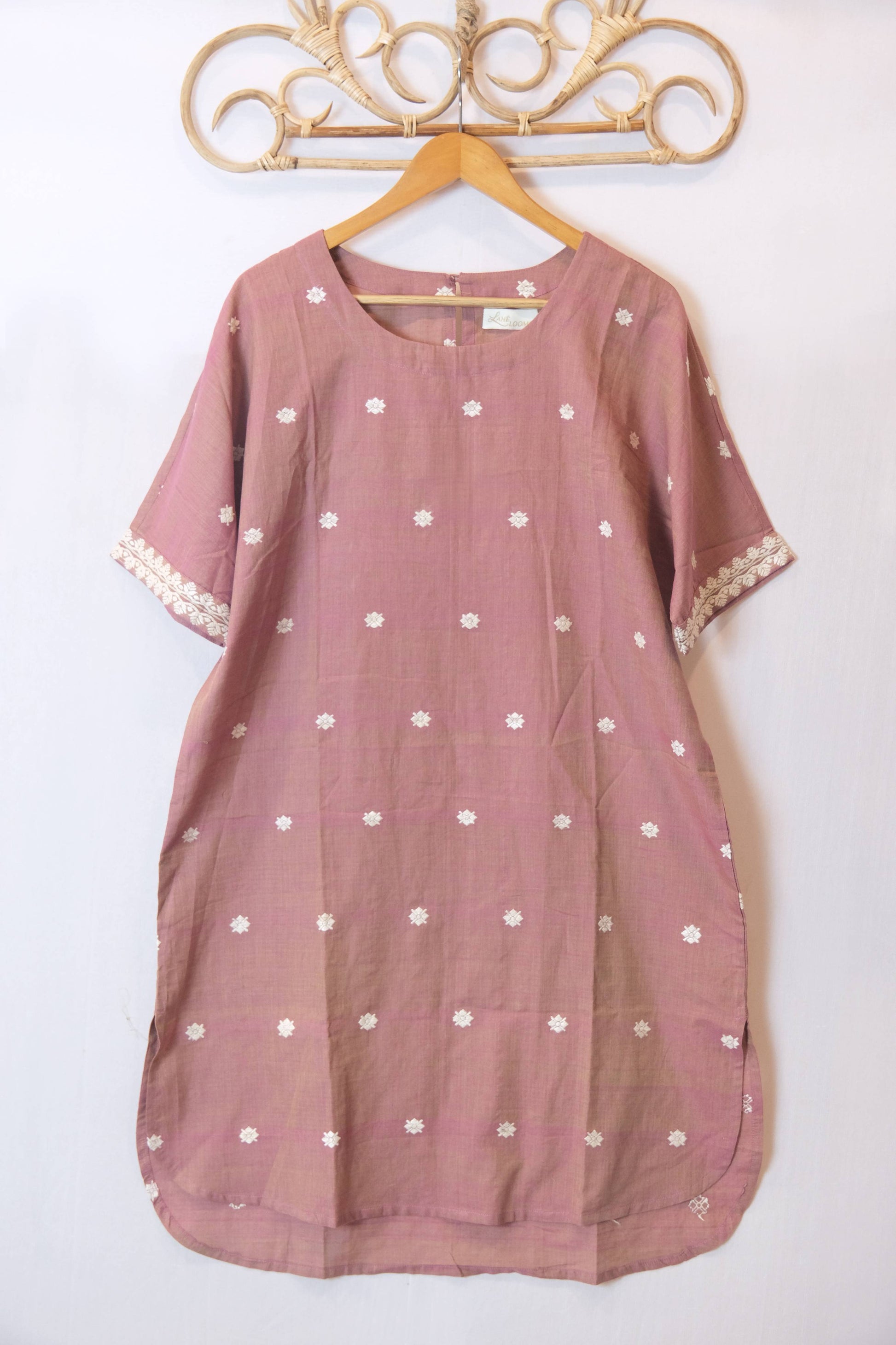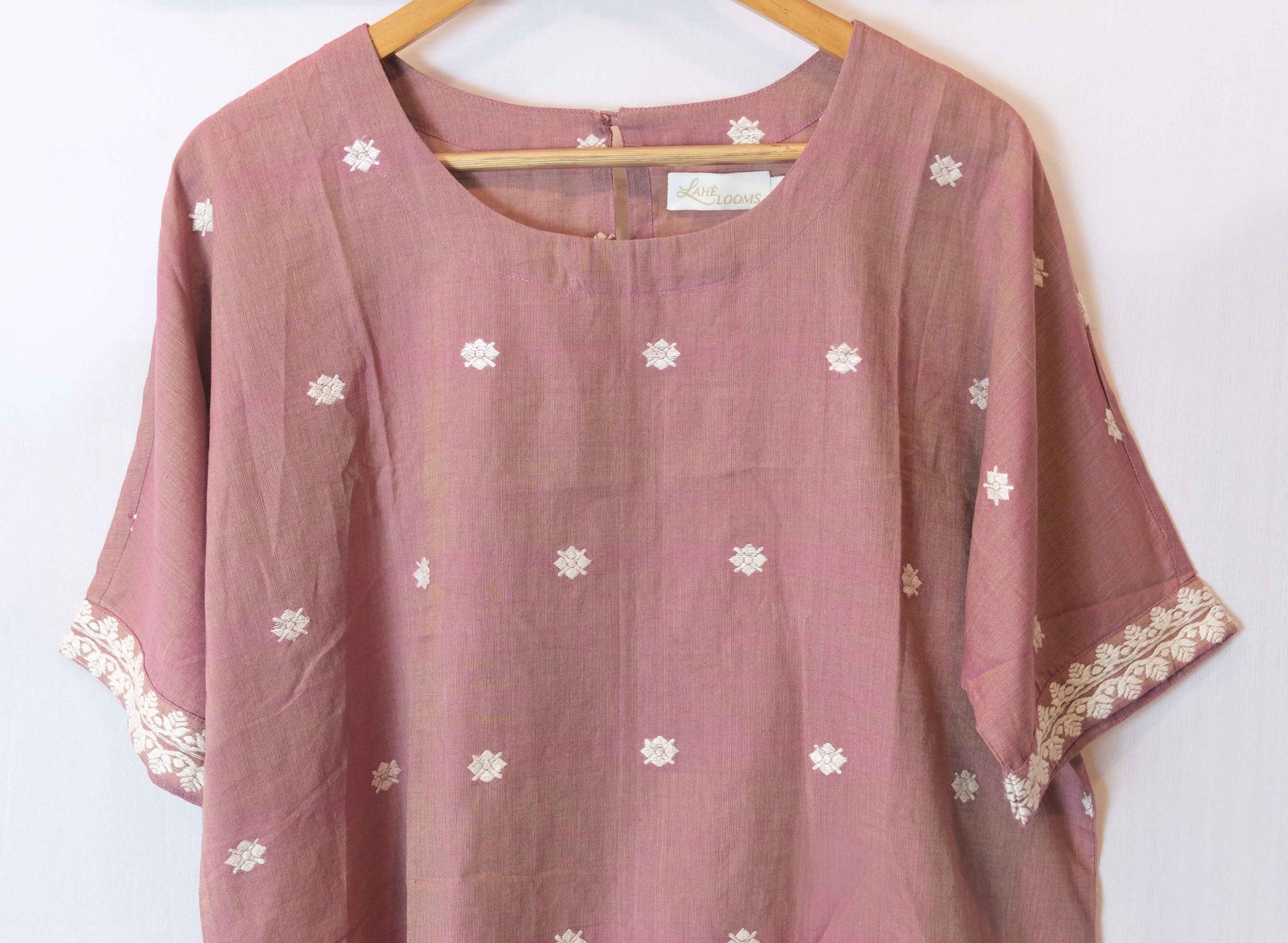 Expertly crafted with centuries-old natural techniques, this tunic features intricate mulberry silk motifs in luxurious Eri silk. Experience the benefits of this sustainable silk that is renowned for its strength, softness, and hypoallergenic properties. Elevate your wardrobe with this blend of traditional artistry and contemporary style.