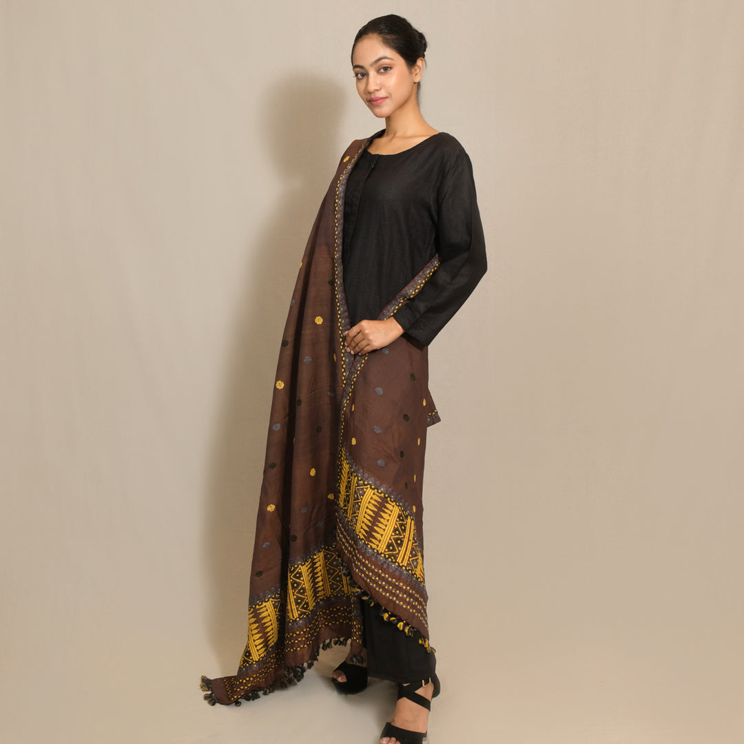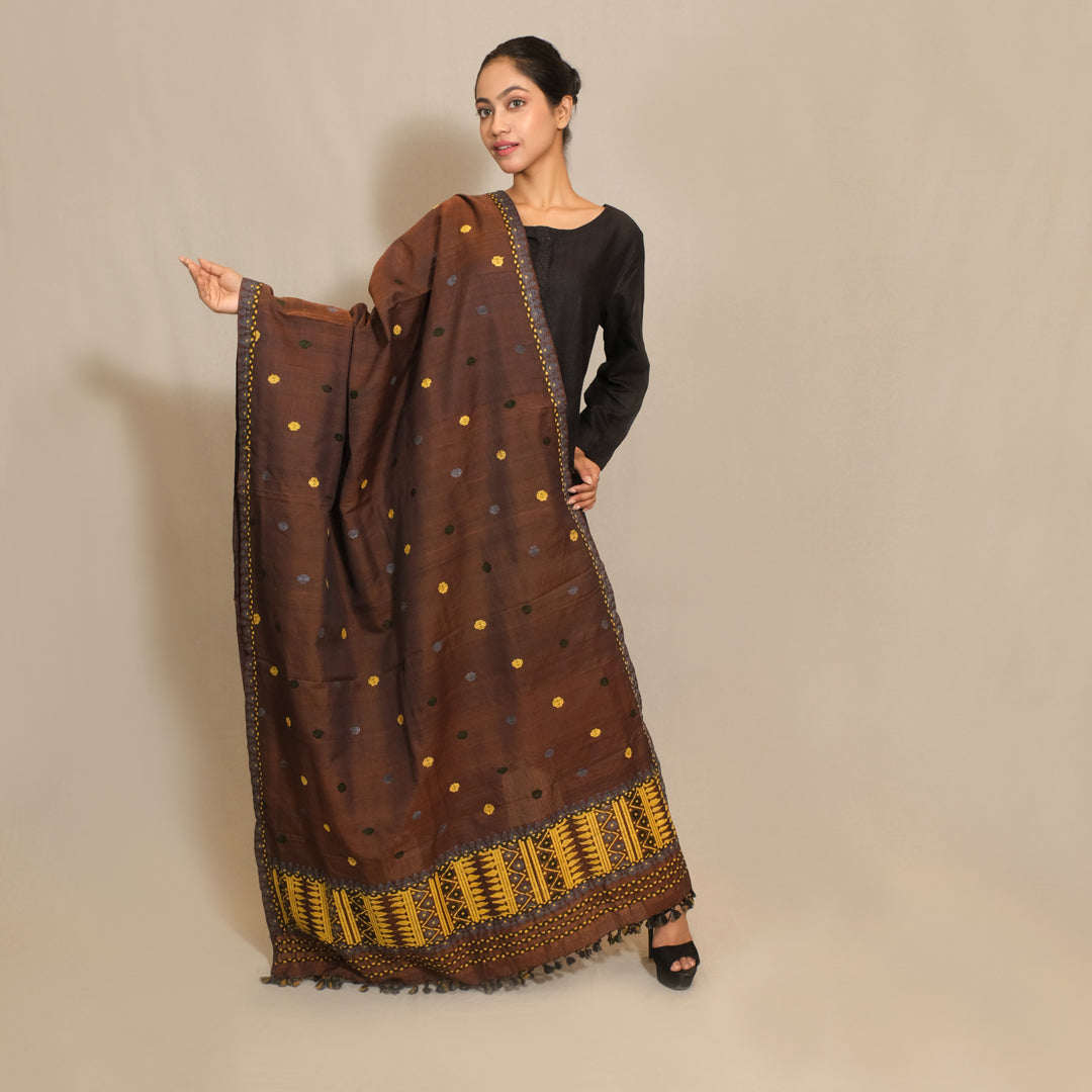 This dupatta expertly combines the natural luster of mulberry silk with the softness and breathability of cotton. The blend creates a lightweight, durable fabric that drapes elegantly, offering both comfort and sophistication. Ideal for enhancing traditional and modern ensembles, it reflects meticulous craftsmanship and premium quality materials.