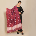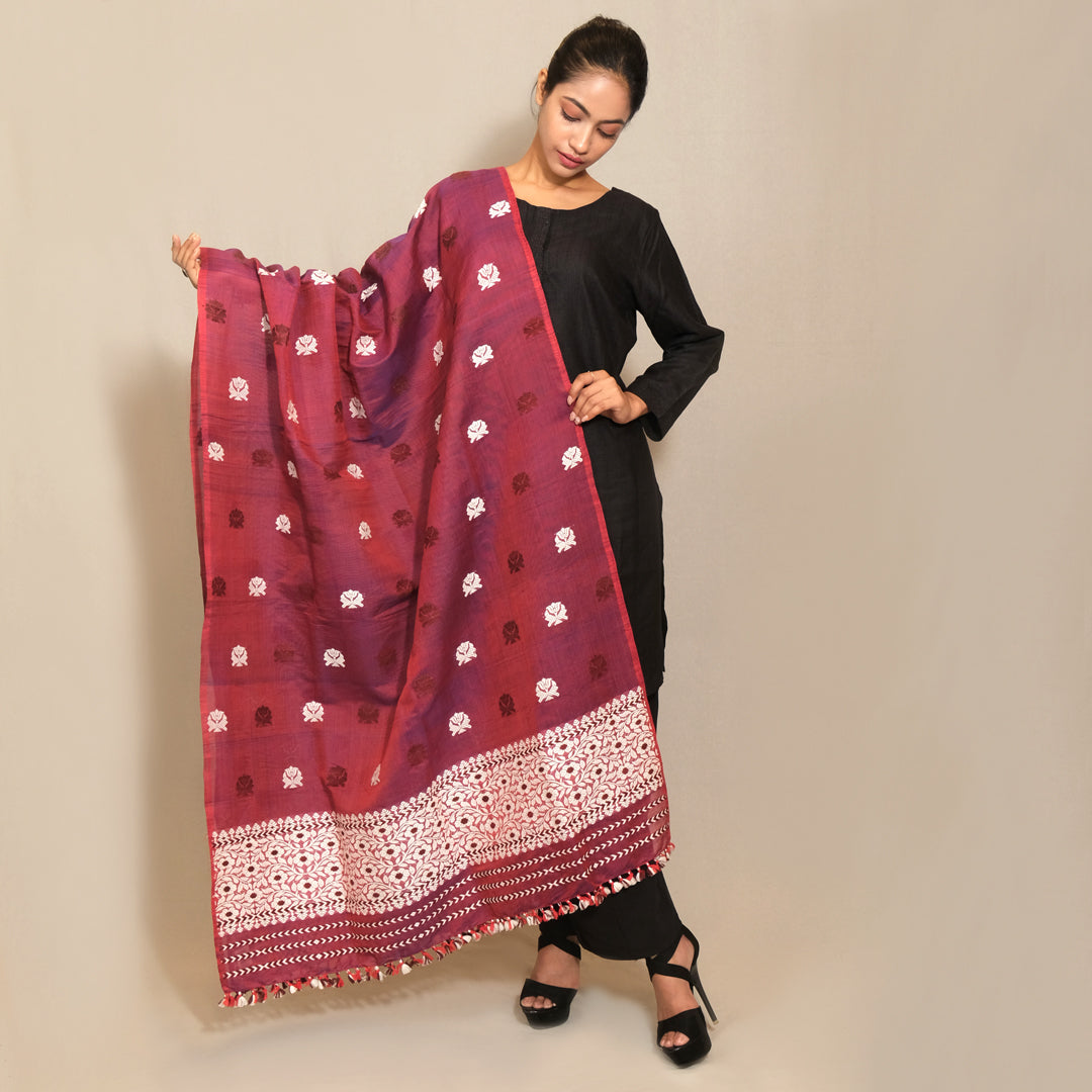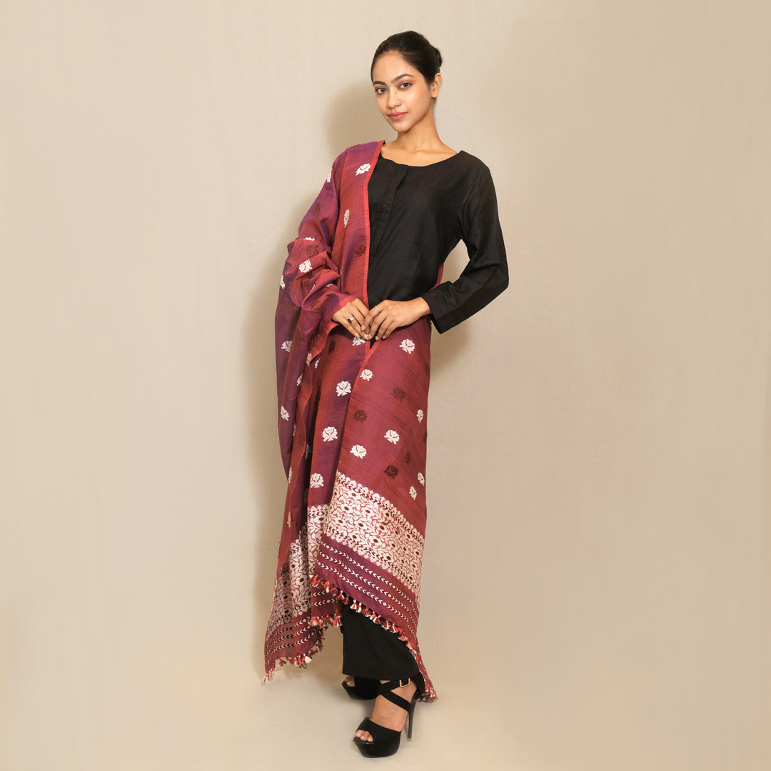 This Dupatta crafted from Kesapat silk and cotton blends the natural sheen of silk with the breathable comfort of cotton. Its fine texture and lightweight feel make it an elegant accessory suitable for both formal and casual occasions, offering versatility and refined style.