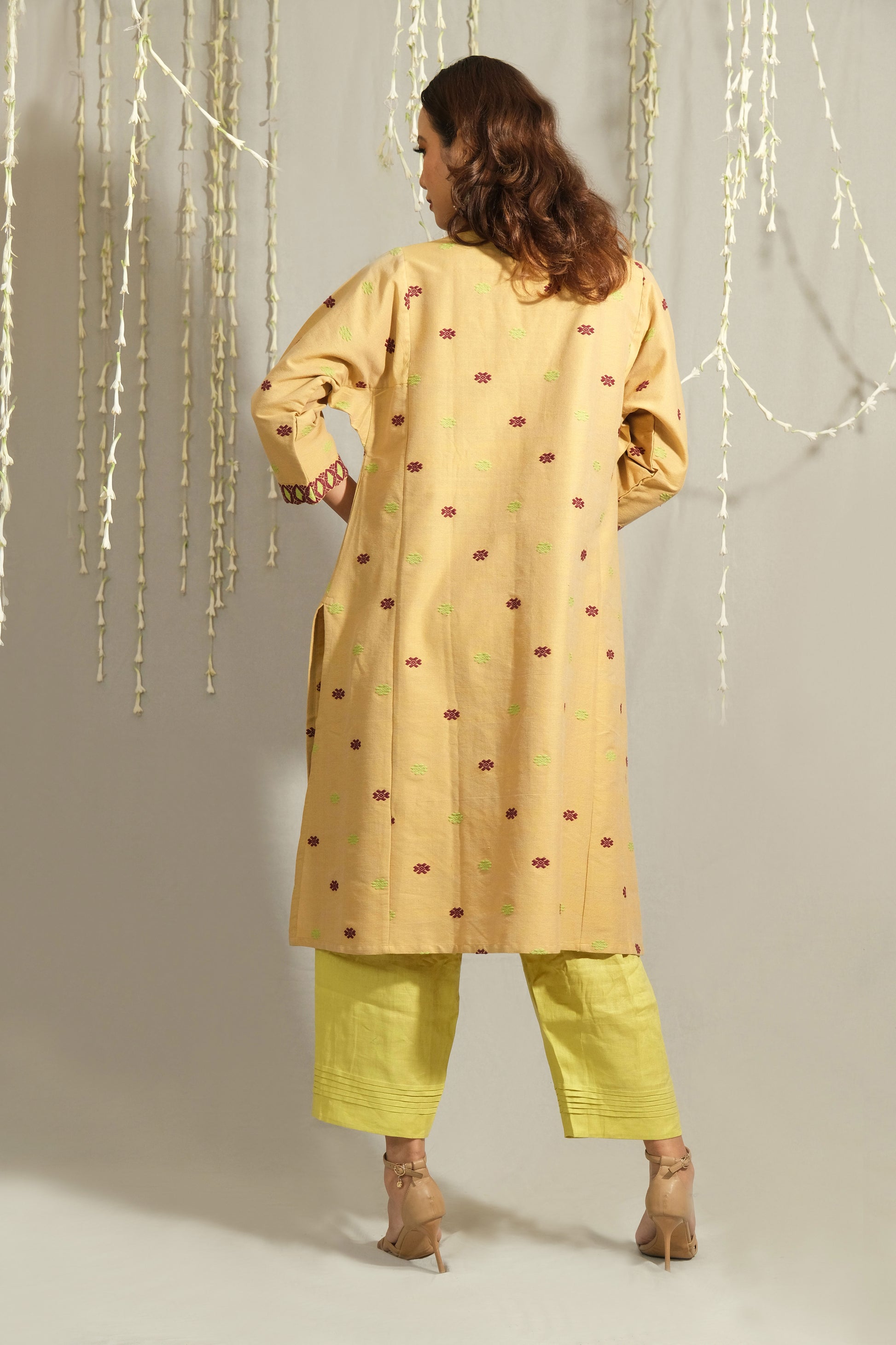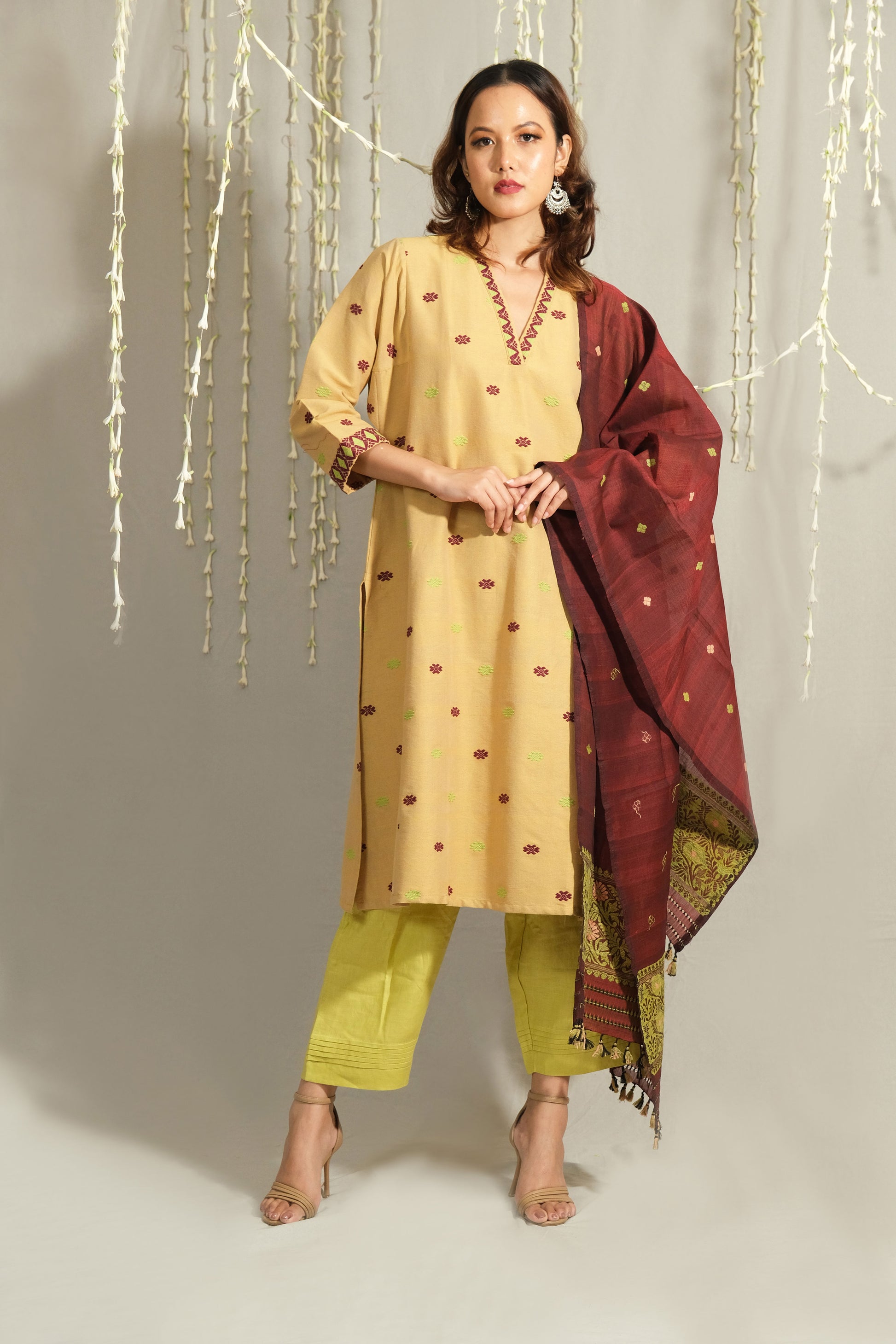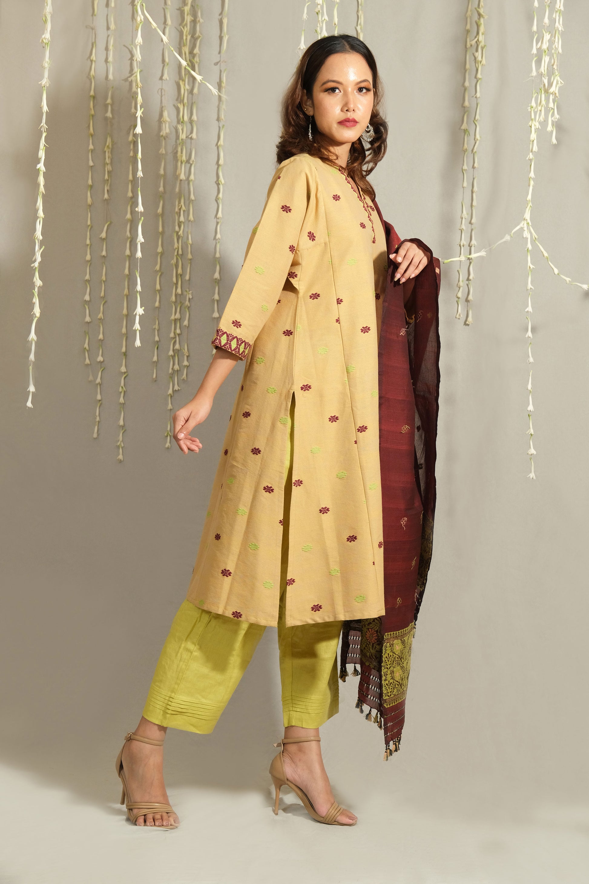 Expertly crafted from luxurious eri silk, this kurta features intricate silk motifs and delicate silver zari accents. Embrace the beauty of traditional Indian fashion with this elegant and timeless piece. Made with high-quality materials, this kurta offers comfort and style for any occasion.