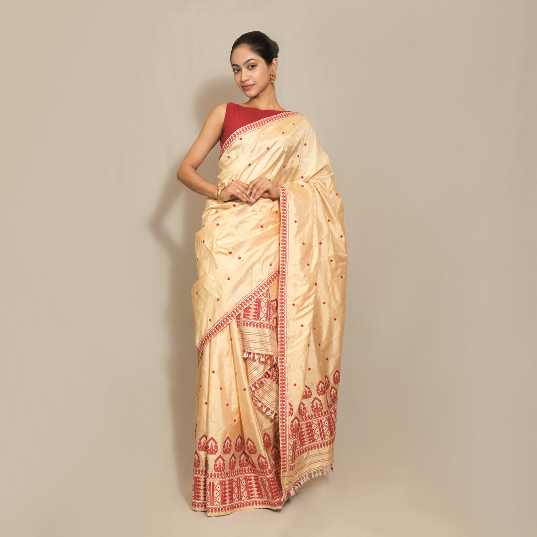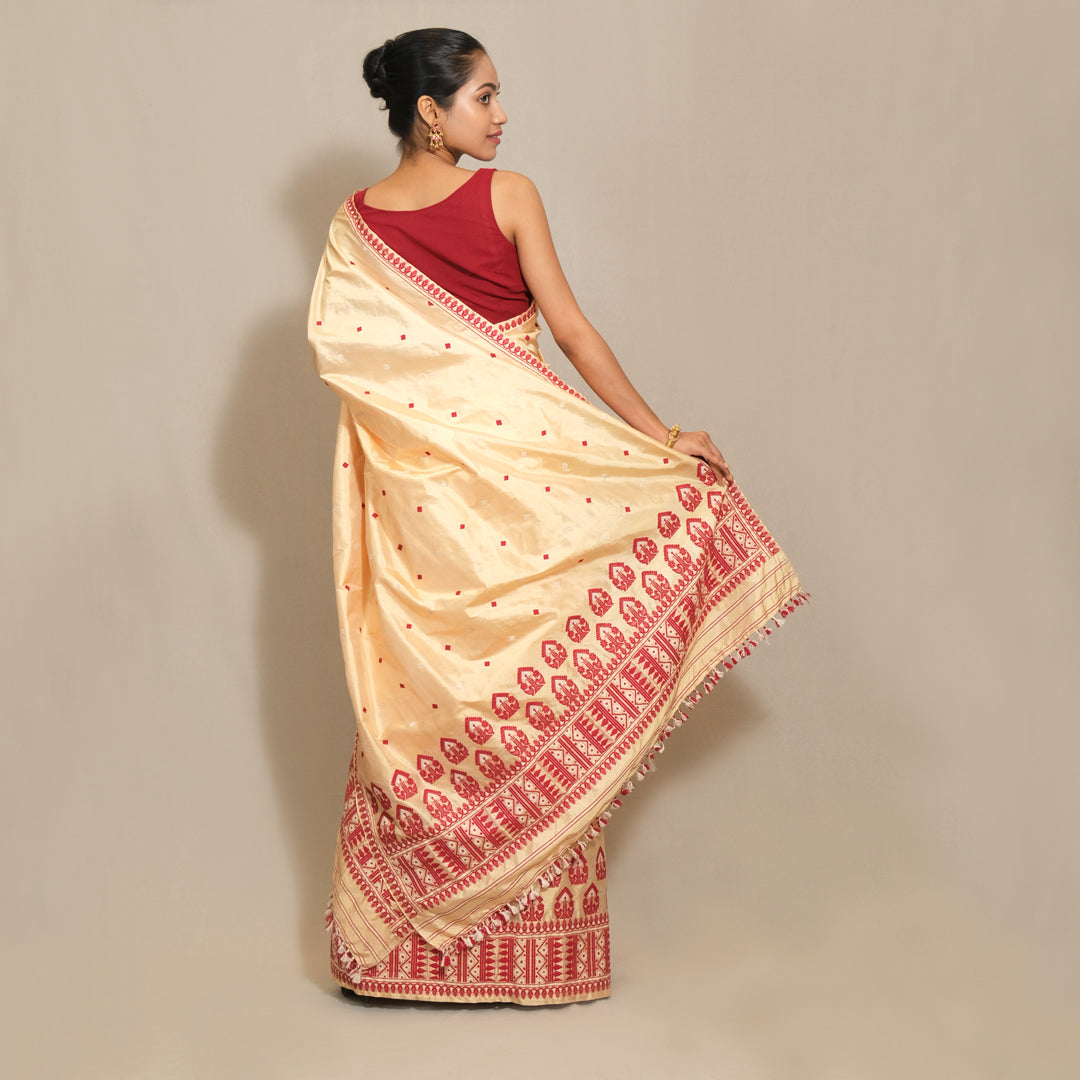 Experience the timeless elegance of the Mekhela Sador crafted from exquisite Paat silk. This traditional Assamese attire showcases fine silk weaving that offers a smooth texture and subtle sheen, perfect for formal occasions and cultural celebrations. Its lightweight and breathable fabric ensures comfort while maintaining a graceful drape, reflecting expert craftsmanship and heritage artistry. Ideal for those who appreciate authentic ethnic wear with a refined touch.