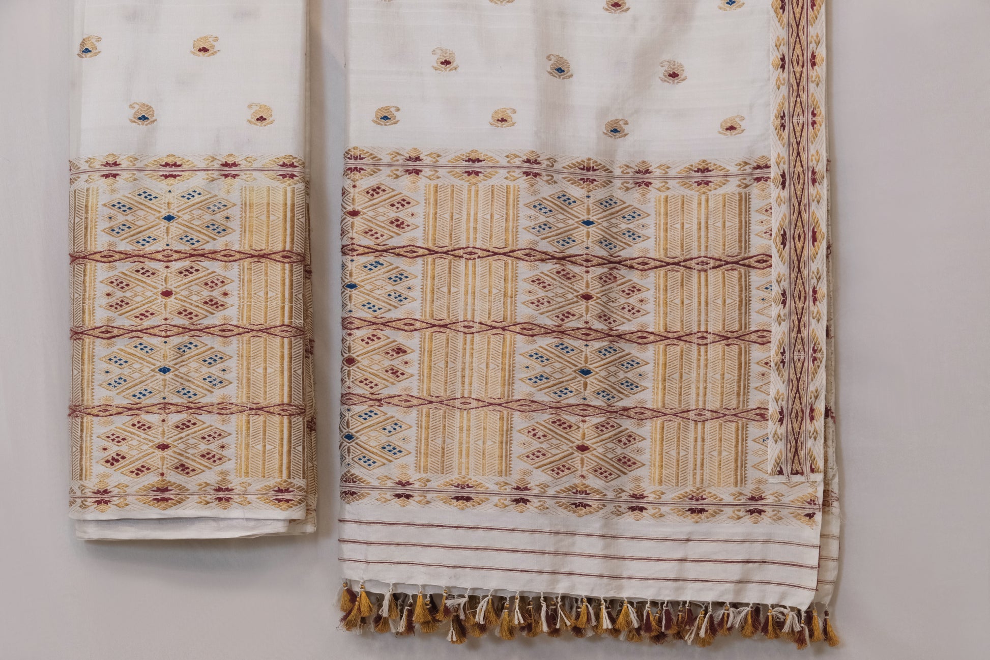 Mekhela Sador - Mulberry silk motifs in golden zari & eri silk natural dye