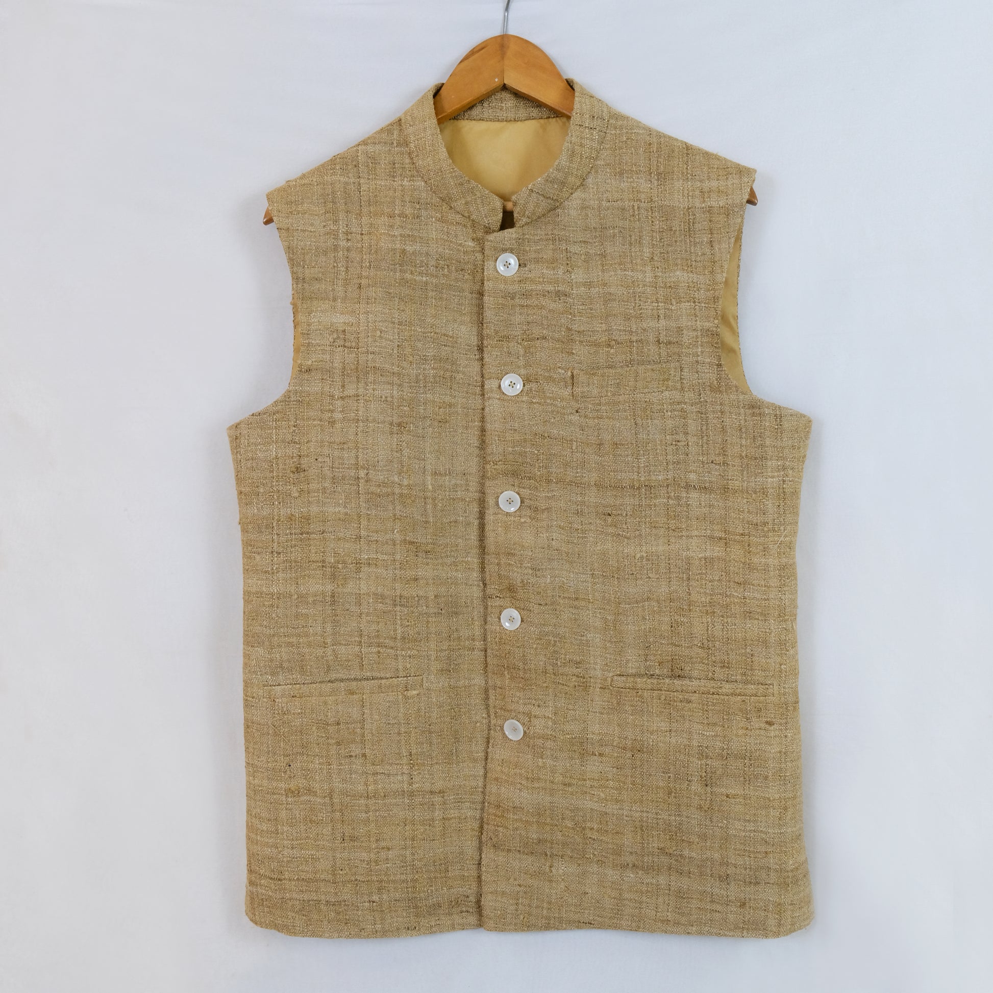 This men's jacket features Muga Ghisa, a rare and prestigious silk variety renowned for its natural golden luster and exceptional resilience. The fabric's inherent strength and lustrous finish create a distinguished appearance that ages beautifully with wear. Muga silk's superior insulating properties offer warmth without excessive weight, making it suitable across varying climates. The jacket's construction honors traditional weaving heritage while delivering modern comfort and sophistication. An investment piece for discerning individuals who appreciate fine craftsmanship and timeless elegance.