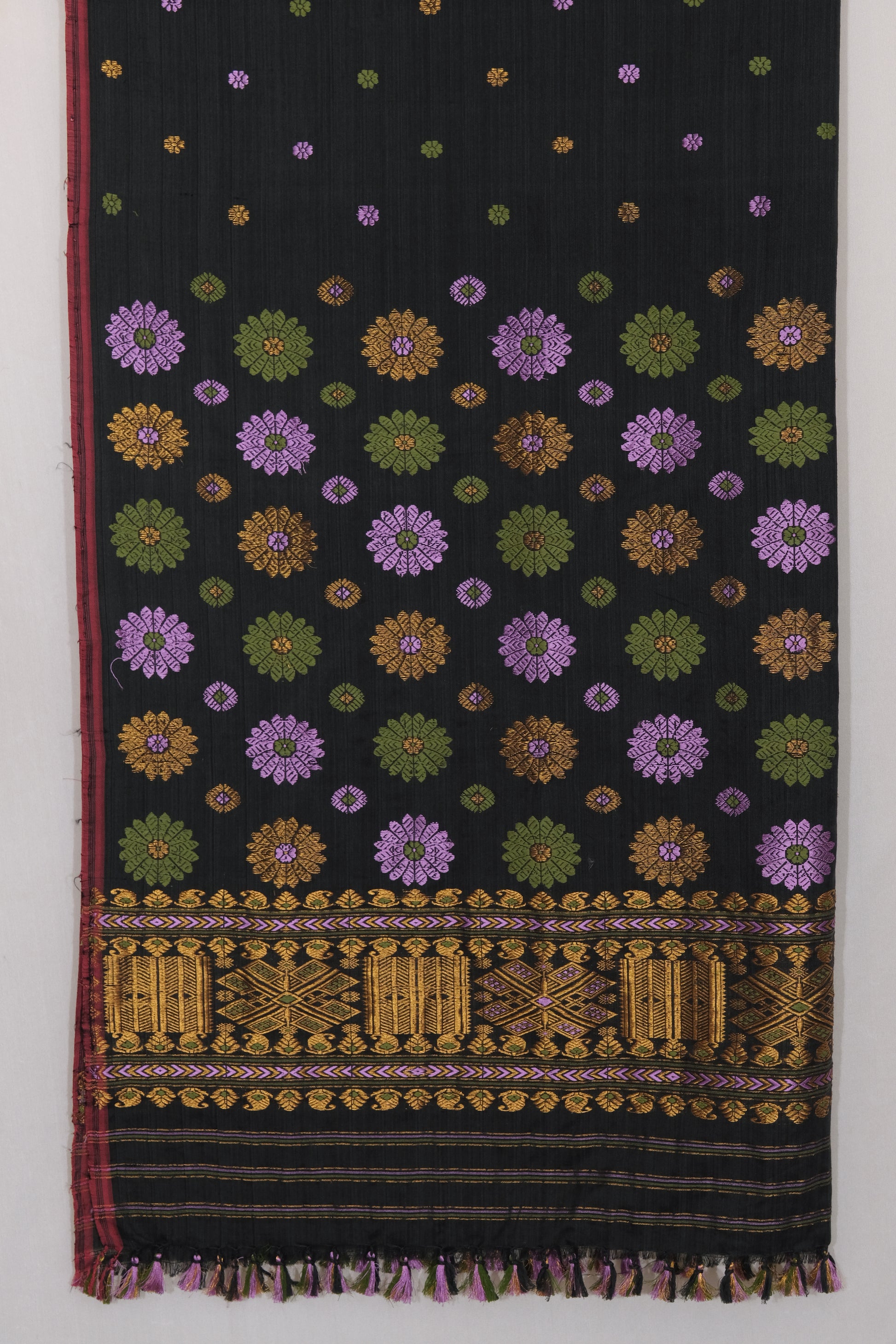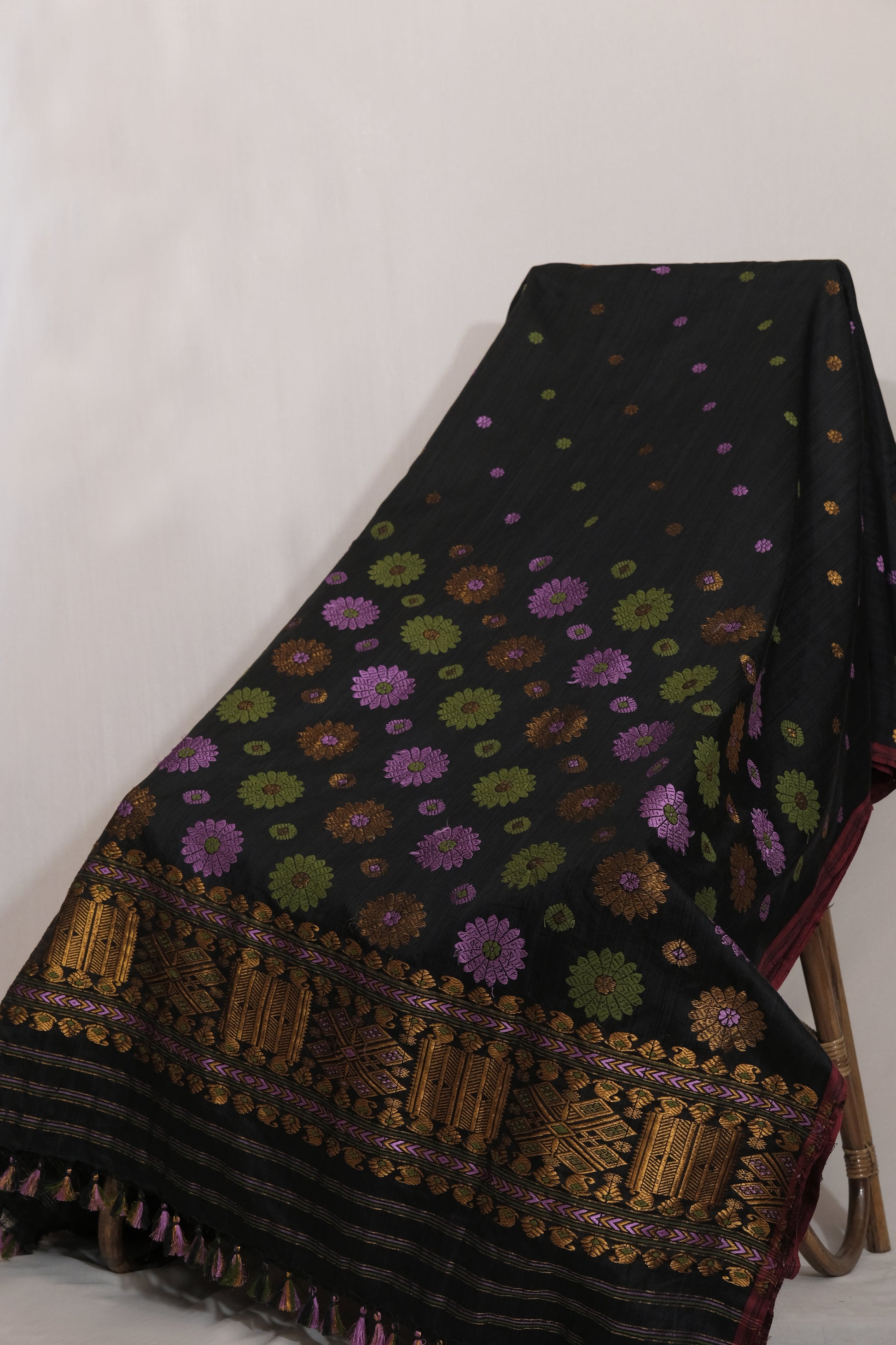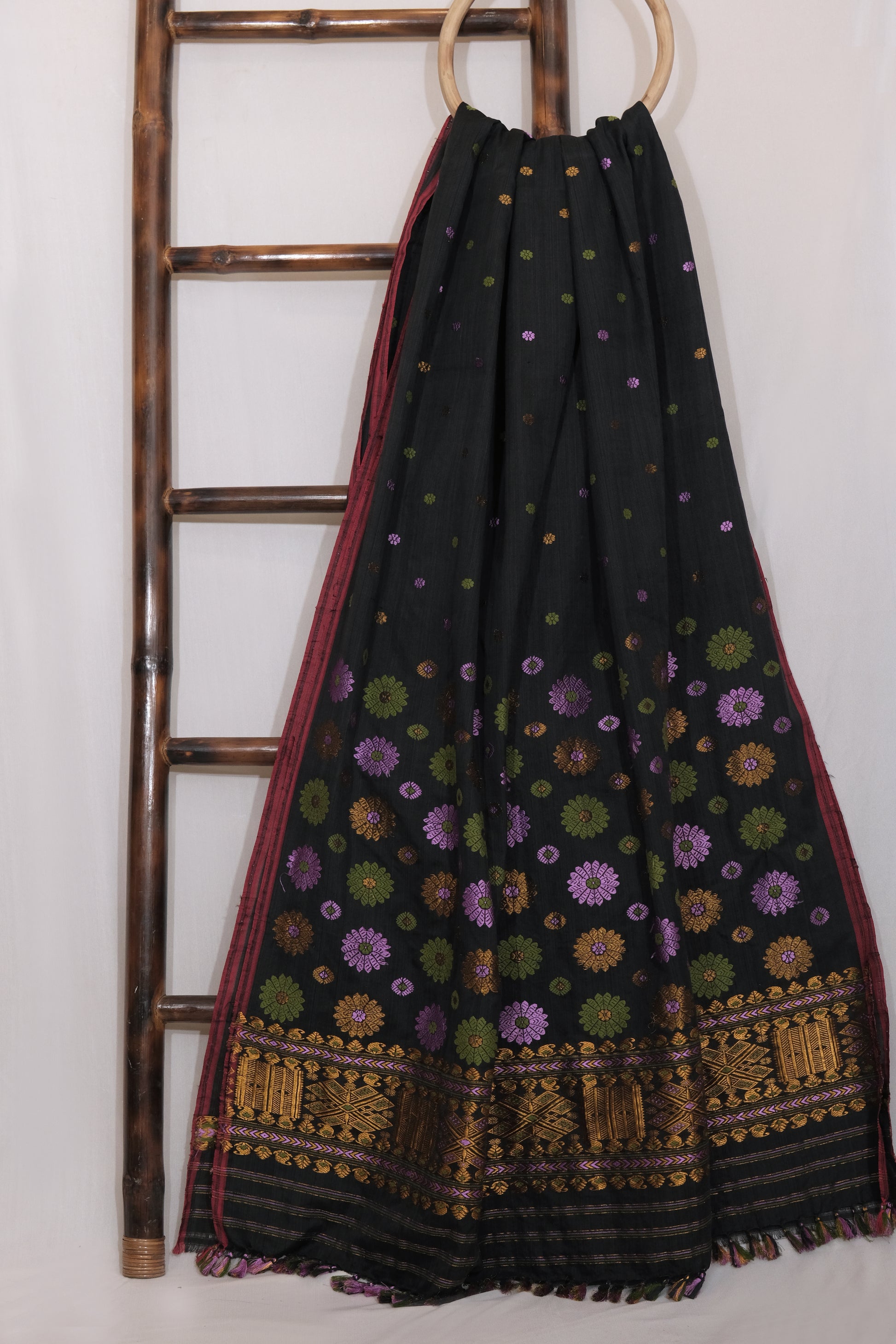 Expertly crafted from a beautiful blend of mulberry silk and cotton, this saree features stunning zari motifs that add a touch of elegance and sophistication to any wardrobe. With its luxurious fabric and intricate details, this saree is perfect for any formal or special occasion.