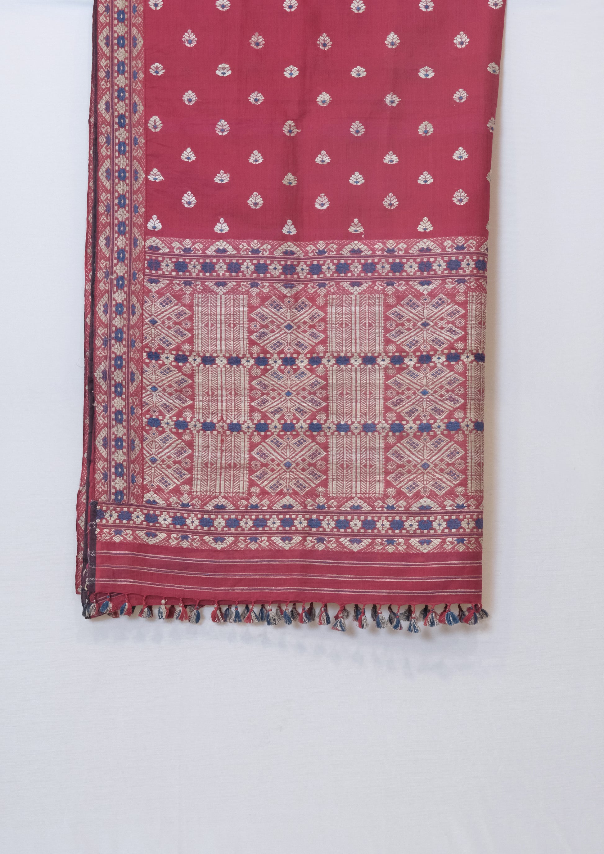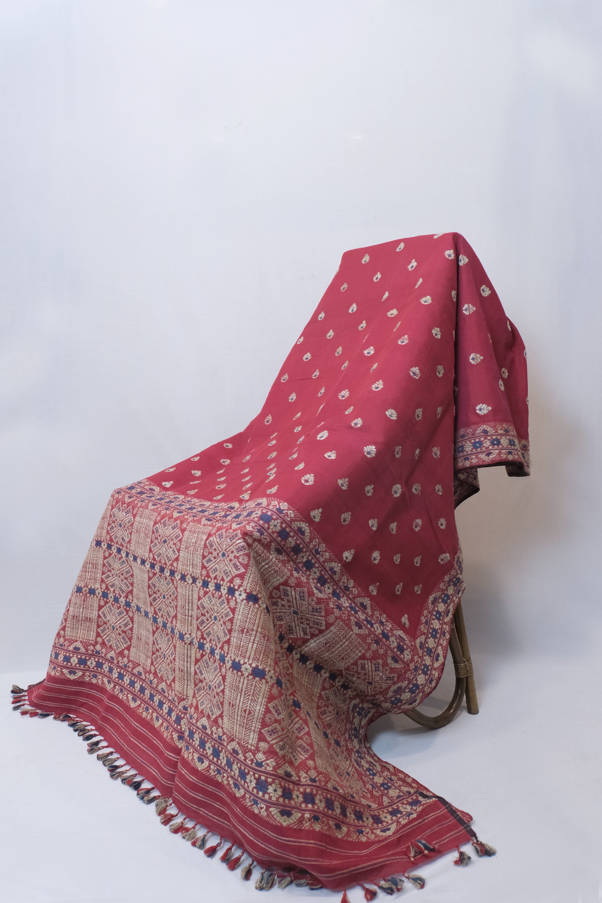 Crafted from the finest Mulberry silk and adorned with delicate Kesapaat motifs, this Saree exudes grace and elegance. The use of traditional Muga ghisa technique adds a unique touch to its luxurious fabric, making it a timeless addition to any wardrobe. Elevate your style with this expertly crafted piece.