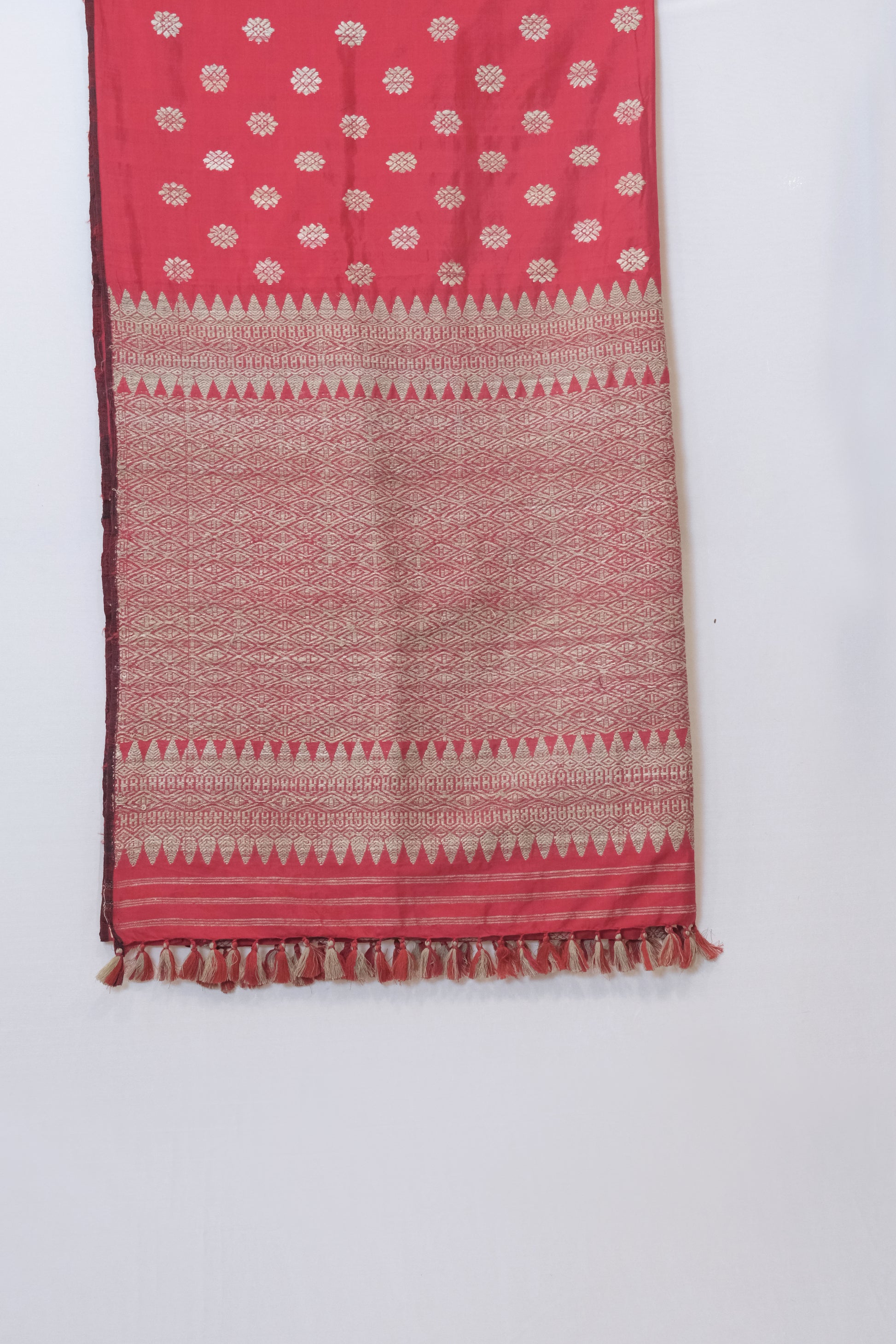 Crafted from luxurious Mulberry silk and cotton, this stunning saree showcases unique motifs in Muga ghisa silk. With a perfect blend of traditional materials and modern design, this saree exudes elegance and sophistication. Elevate any occasion with this one-of-a-kind piece.