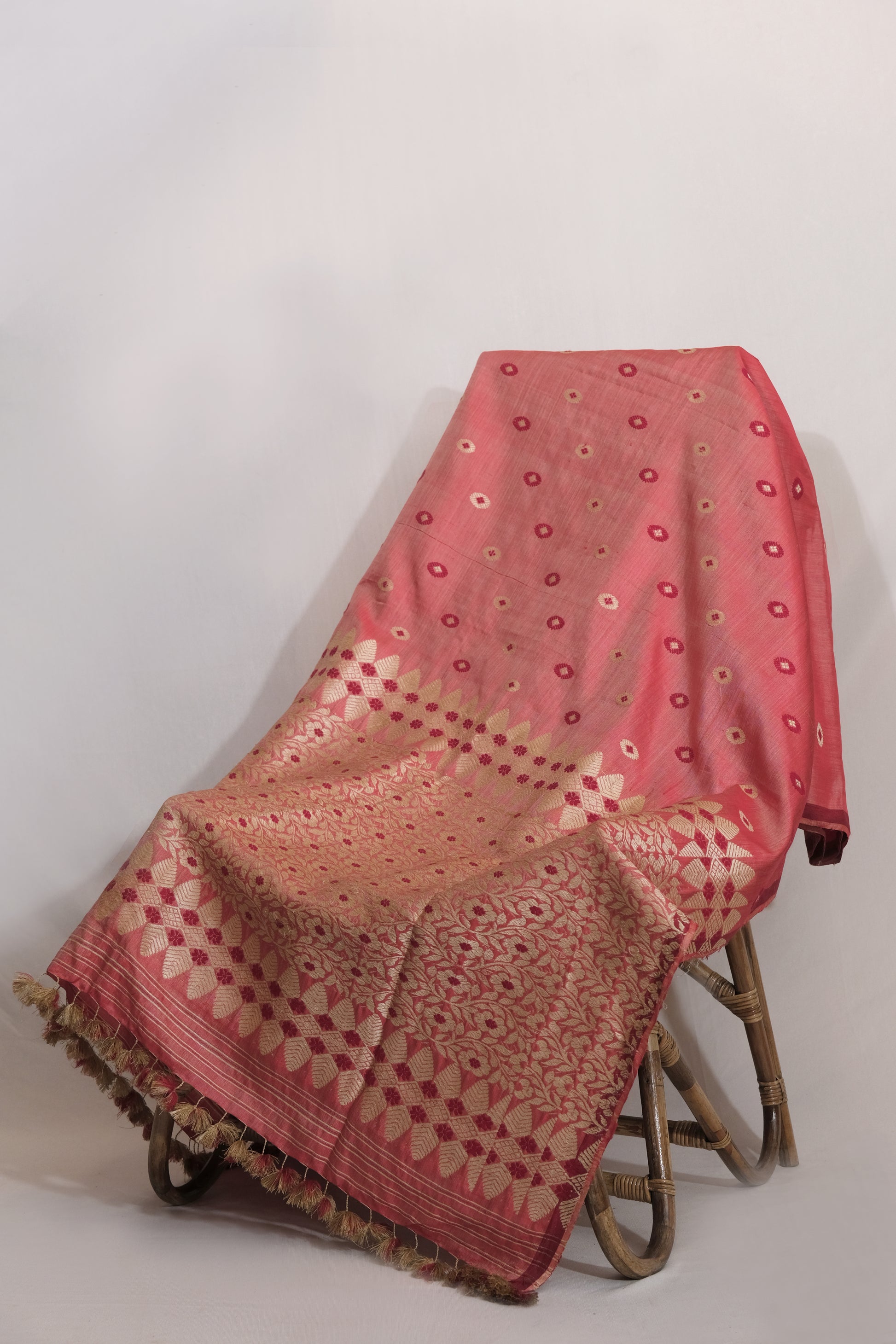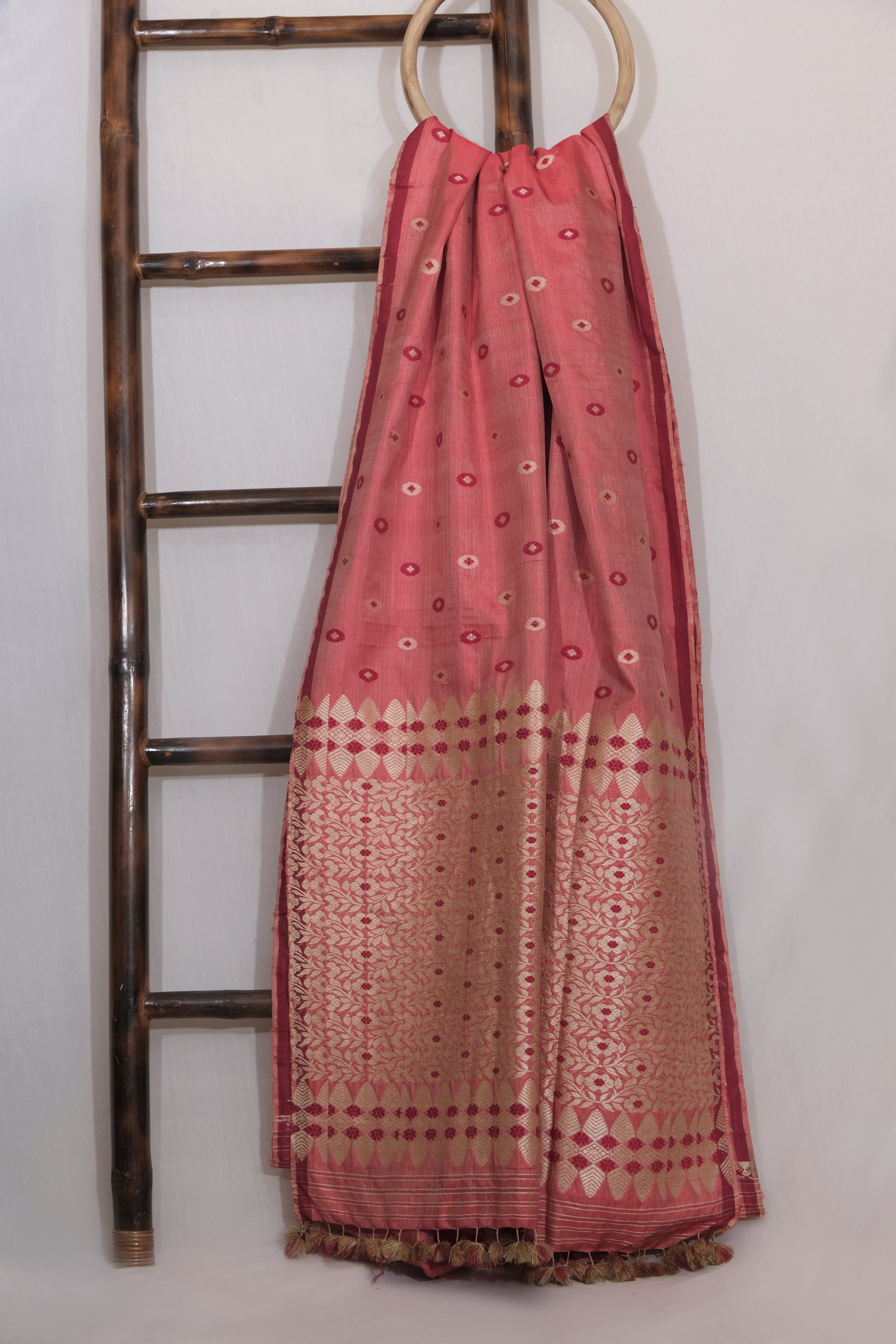 Elevate your style with our luxurious Saree, crafted from a blend of Tassar and Mulbarry silk with stunning Muga silk motifs. Enjoy the benefits of natural silk fibers, known for their durability and luxurious feel. Step out in confidence with this statement piece.