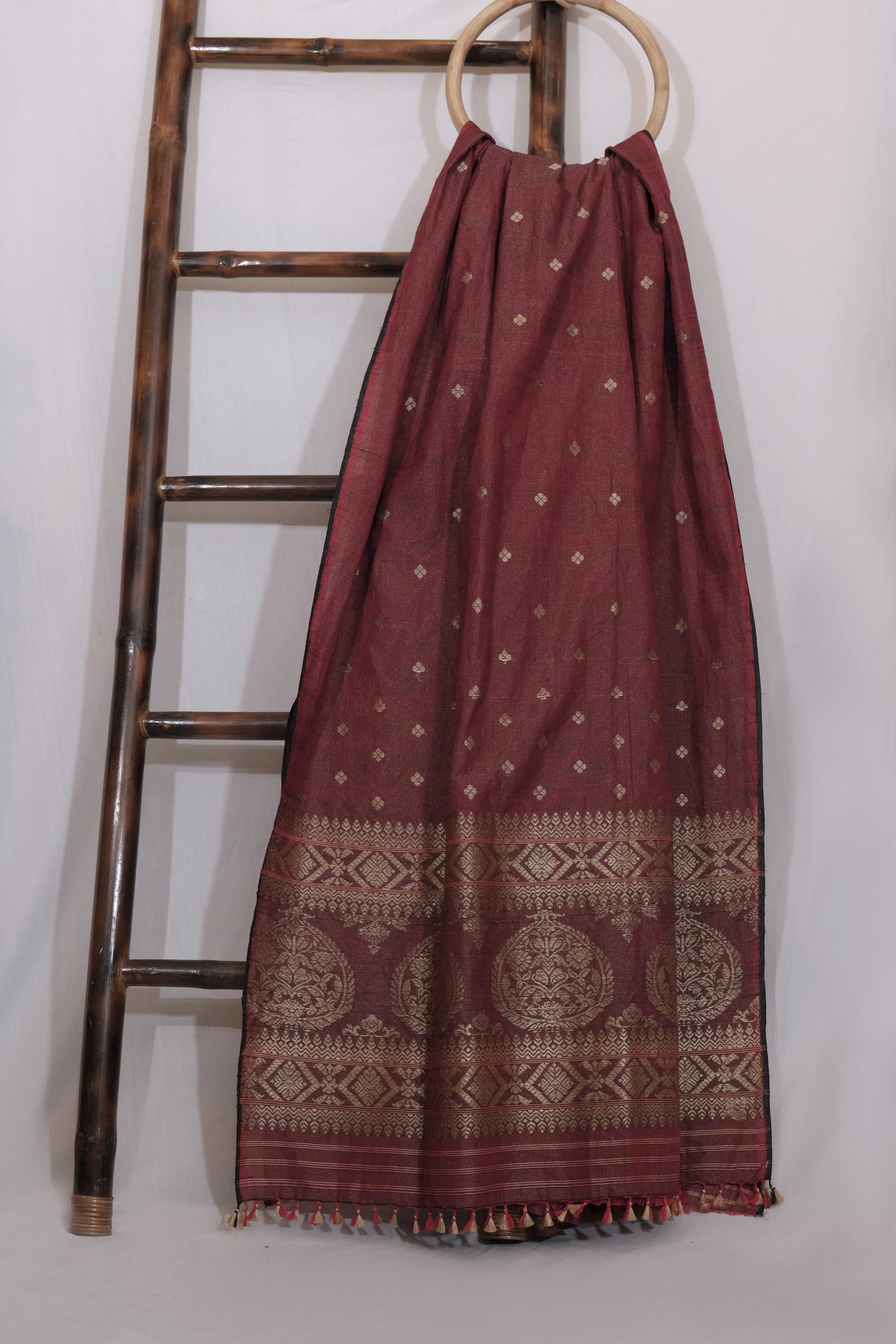 Introducing our luxurious Tassar silk Saree, adorned with intricate tissue and cotton motifs. Made from high-quality materials, this saree offers a unique blend of elegance and comfort. Perfect for any occasion, add a touch of sophistication to your wardrobe with this stunning piece.