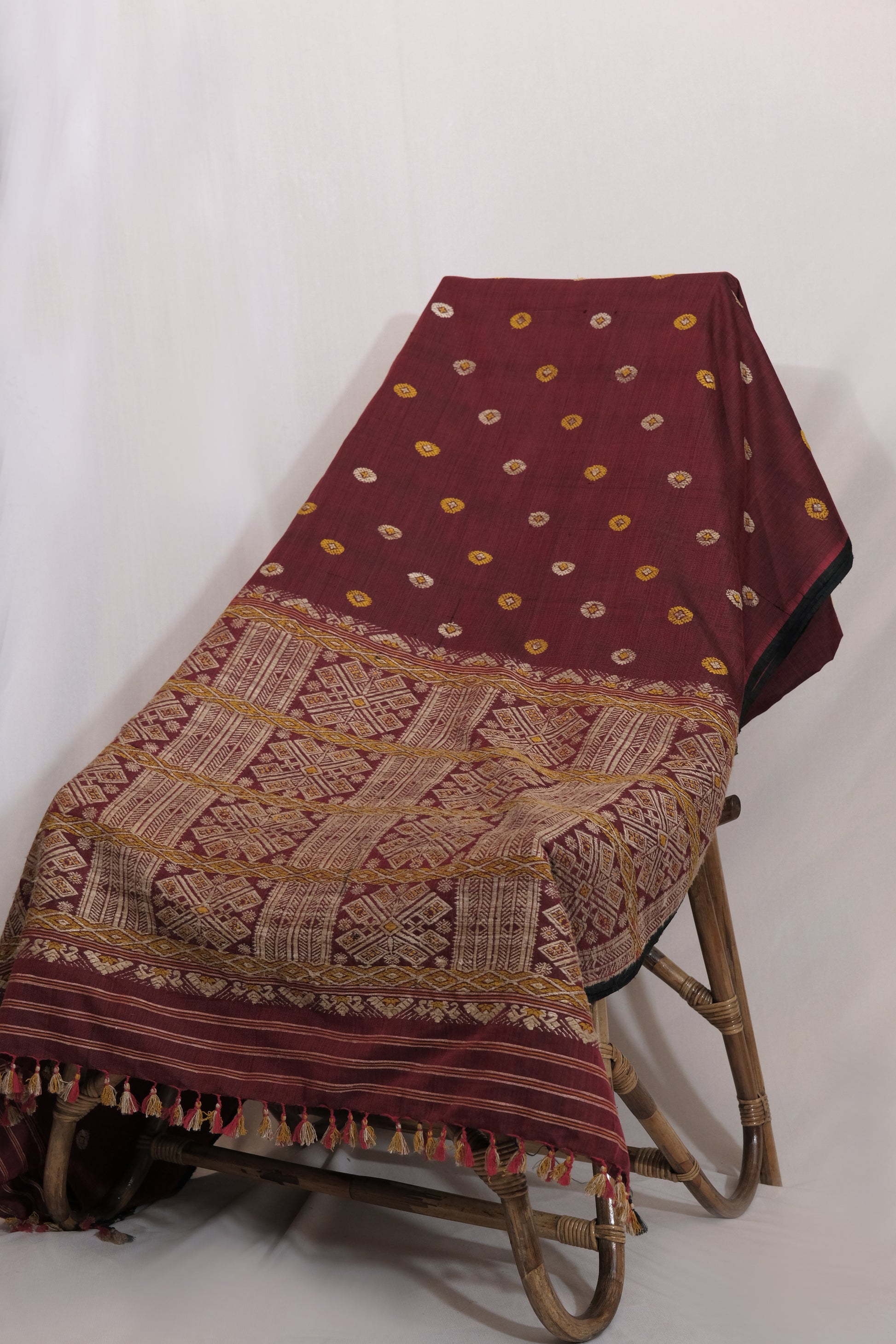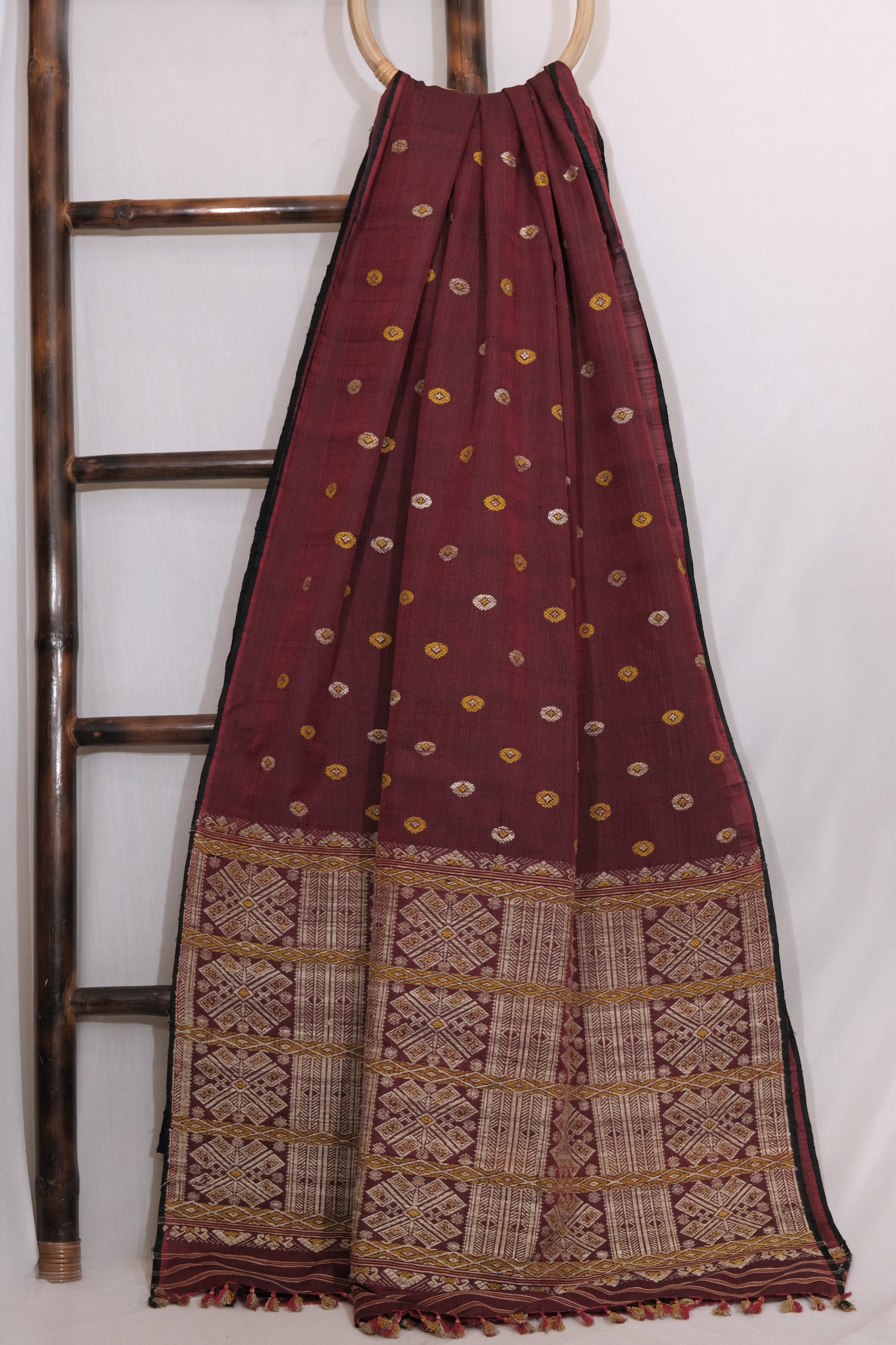 Made from a luxurious blend of Mulberry silk and cotton, our Saree features intricate motifs in Muga ghisa silk and is naturally dyed with Eri silk. Enjoy the benefits of indulging in high-quality fabrics while supporting sustainable and ethical practices.