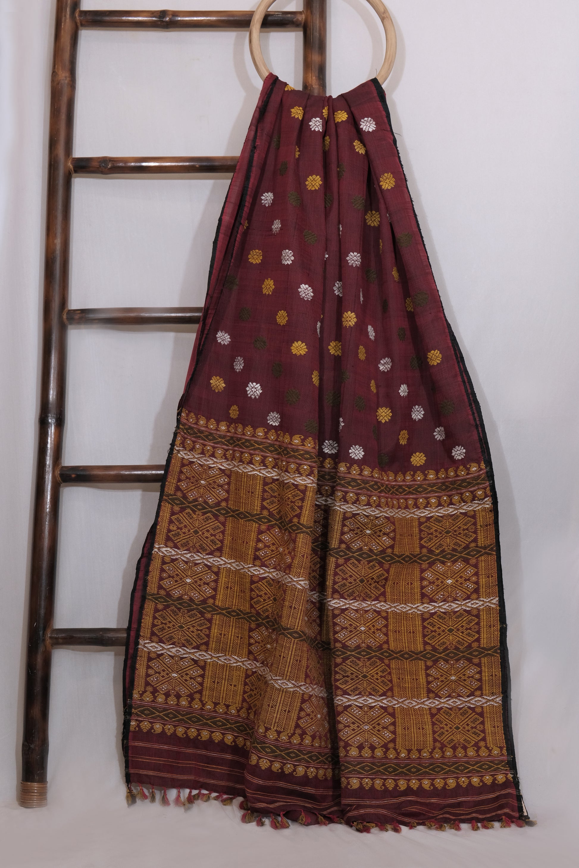 This saree is made from a beautiful blend of Mulberry silk and cotton, adorned with intricate motifs crafted in Eri silk. Using natural dyes, each saree is uniquely colored and adds a touch of elegance and sustainability to any wardrobe. Expertly crafted for a luxurious and eco-friendly experience.