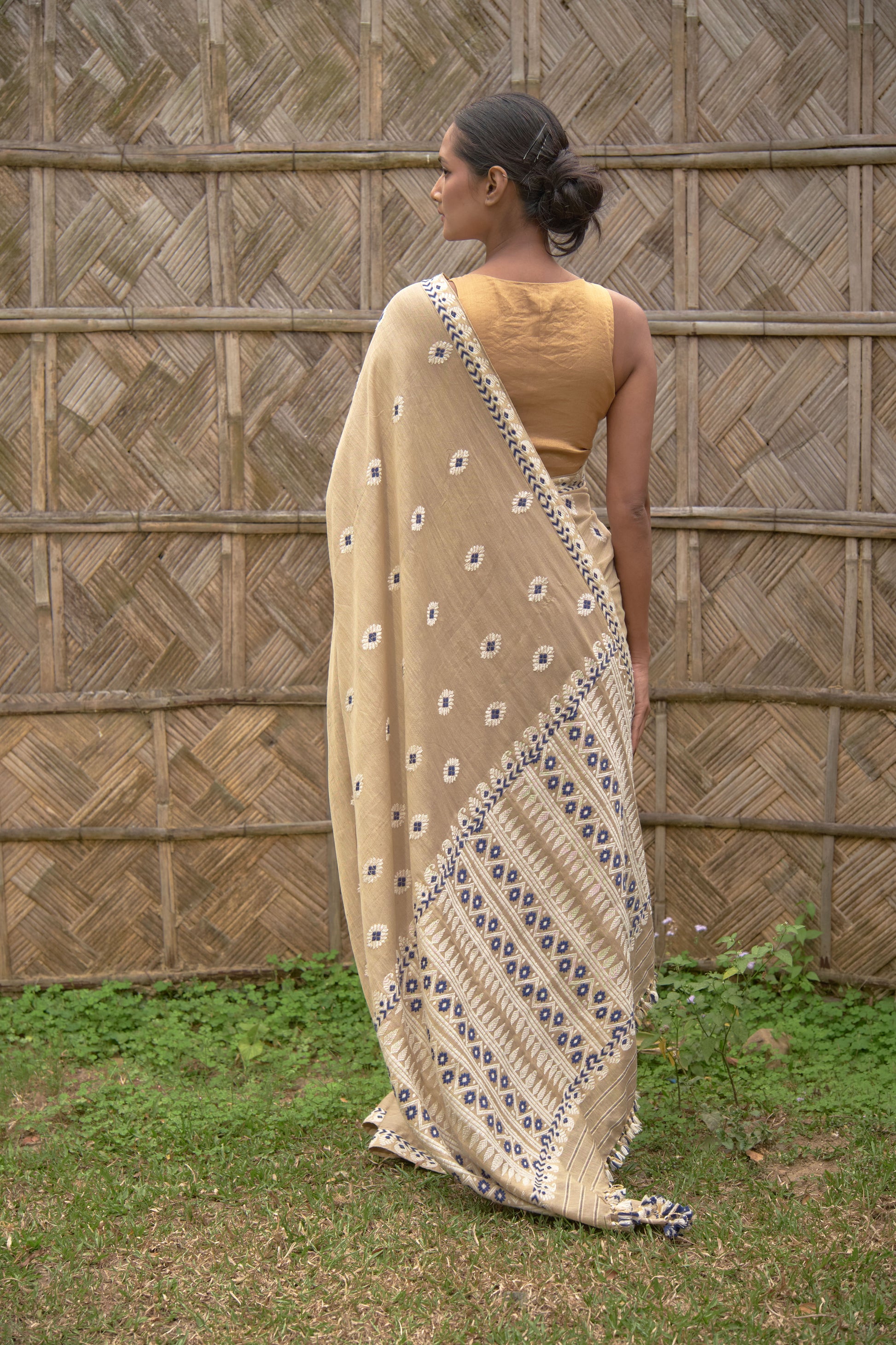 Expertly crafted by hand, our Saree is made from the finest quality Mulberry silk and eri silk. The intricate cotton motifs add a touch of elegance to this traditional Indian garment, making it perfect for any special occasion. Enjoy the luxurious feel and timeless beauty of this unique saree.