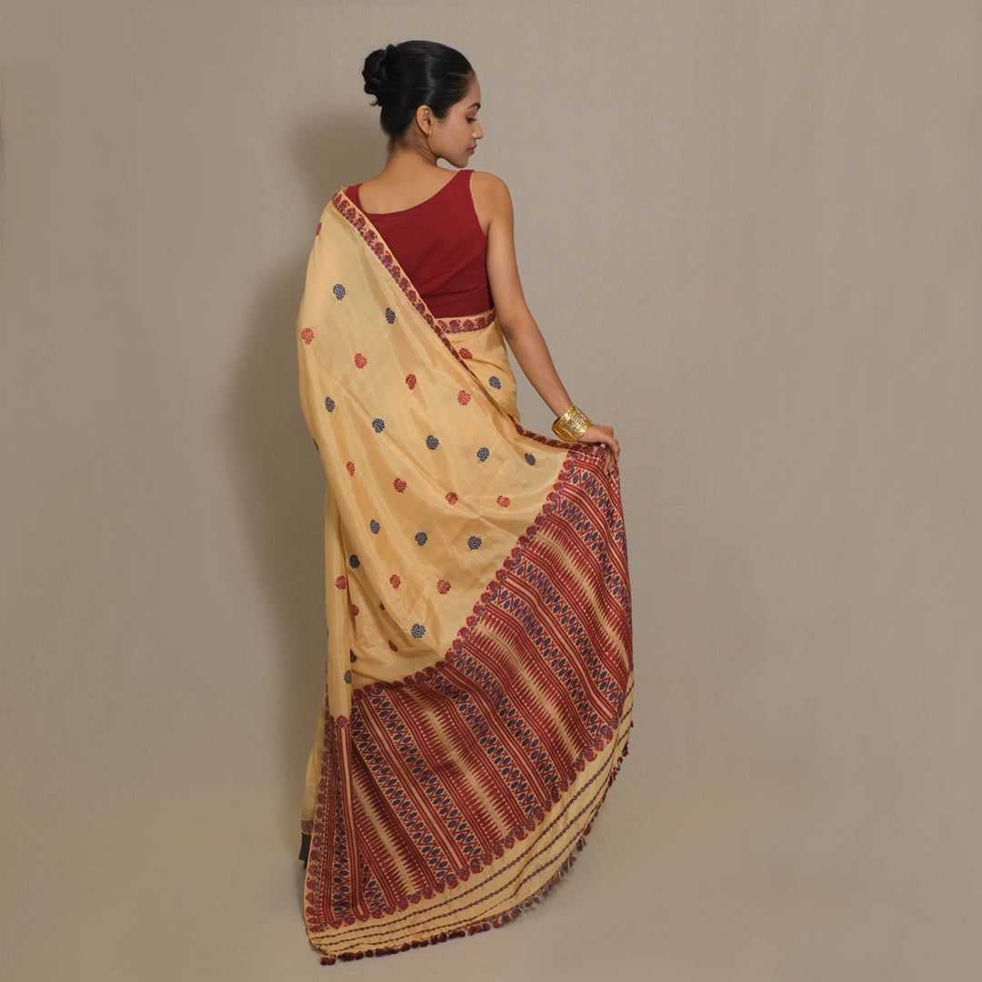 This saree expertly combines Paat silk with cotton, delivering a fabric that balances durability and comfort. The Paat silk imparts a subtle sheen and strength, while the cotton ensures breathability and softness. Its elegant drape and traditional weaving make it suitable for both formal occasions and everyday wear, reflecting skilled craftsmanship and timeless appeal.