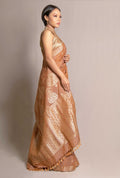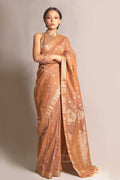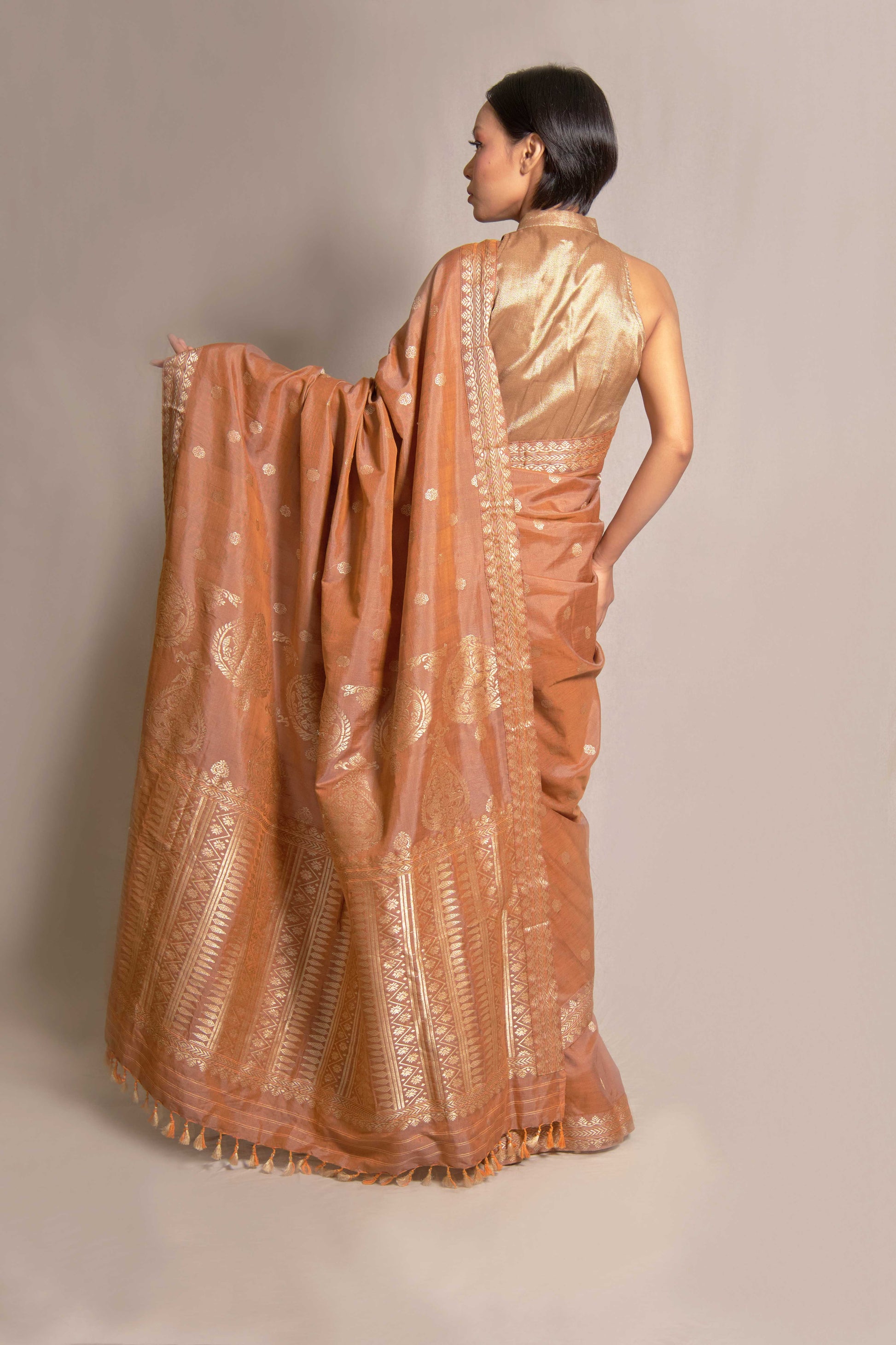 This exquisite saree combines the richness of Mulberry silk with delicate cotton motifs, all woven into elegant Tassar silk fabric. The blend highlights the natural sheen and durability of Mulberry silk, complemented by the artisanal cotton designs that add texture and cultural depth. Ideal for formal occasions, this saree offers a sophisticated balance of tradition and refined craftsmanship.