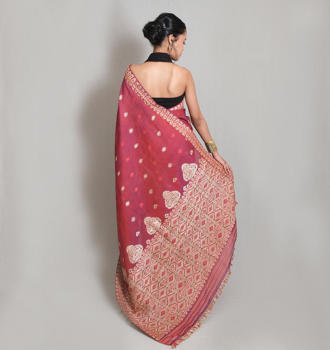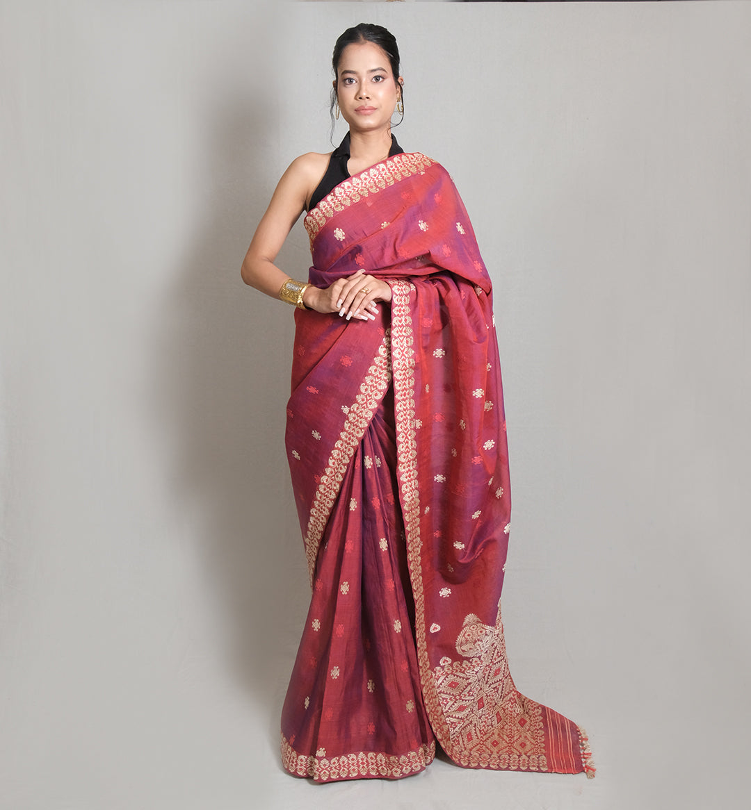 Expertly crafted with Kesapat silk and cotton, this Saree showcases stunning motifs in Muga ghisa. The perfect blend of traditional and modern fabrics, this Saree exudes elegance and sophistication. Its unique design and high-quality materials make it a must-have for any fashion-forward individual.