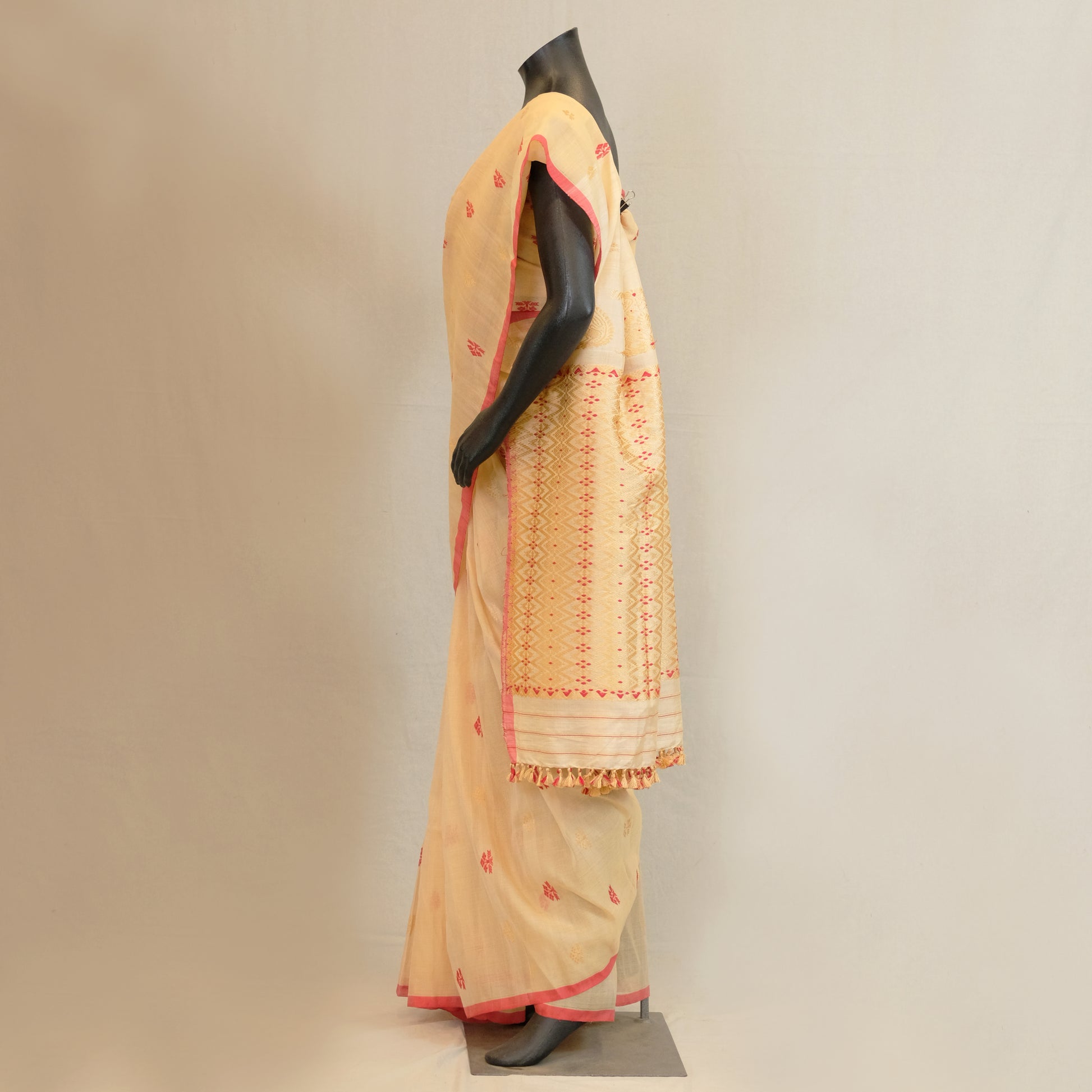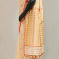 Elegant saree crafted from premium mulberry silk (Kesapat) blended with soft cotton for comfort and breathability. Intricate motifs are beautifully rendered in rich tassar silk, adding depth and texture to the weave. The combination of these natural fibers creates a luxurious drape with a subtle sheen, perfect for both everyday wear and special occasions. The tassar silk accents catch light gracefully, enhancing the saree's sophisticated appeal. Ideal for those who appreciate traditional craftsmanship and quality materials.