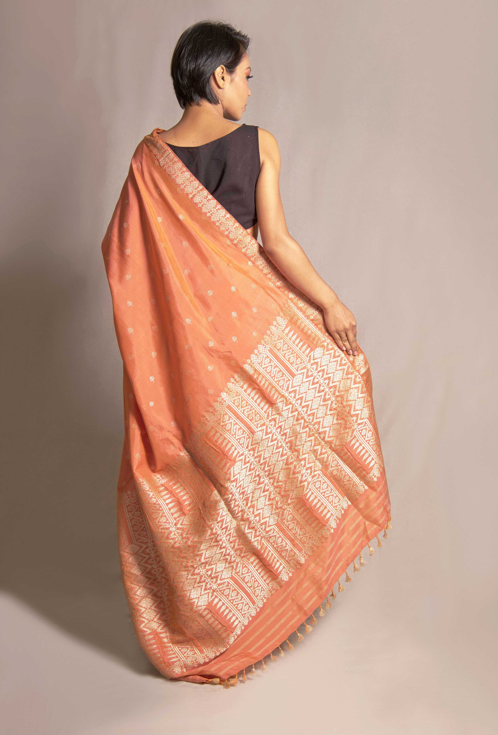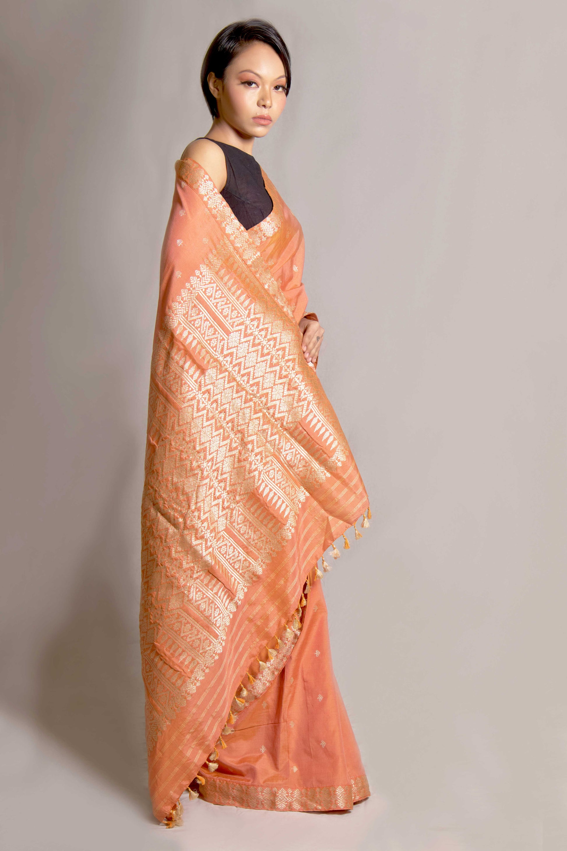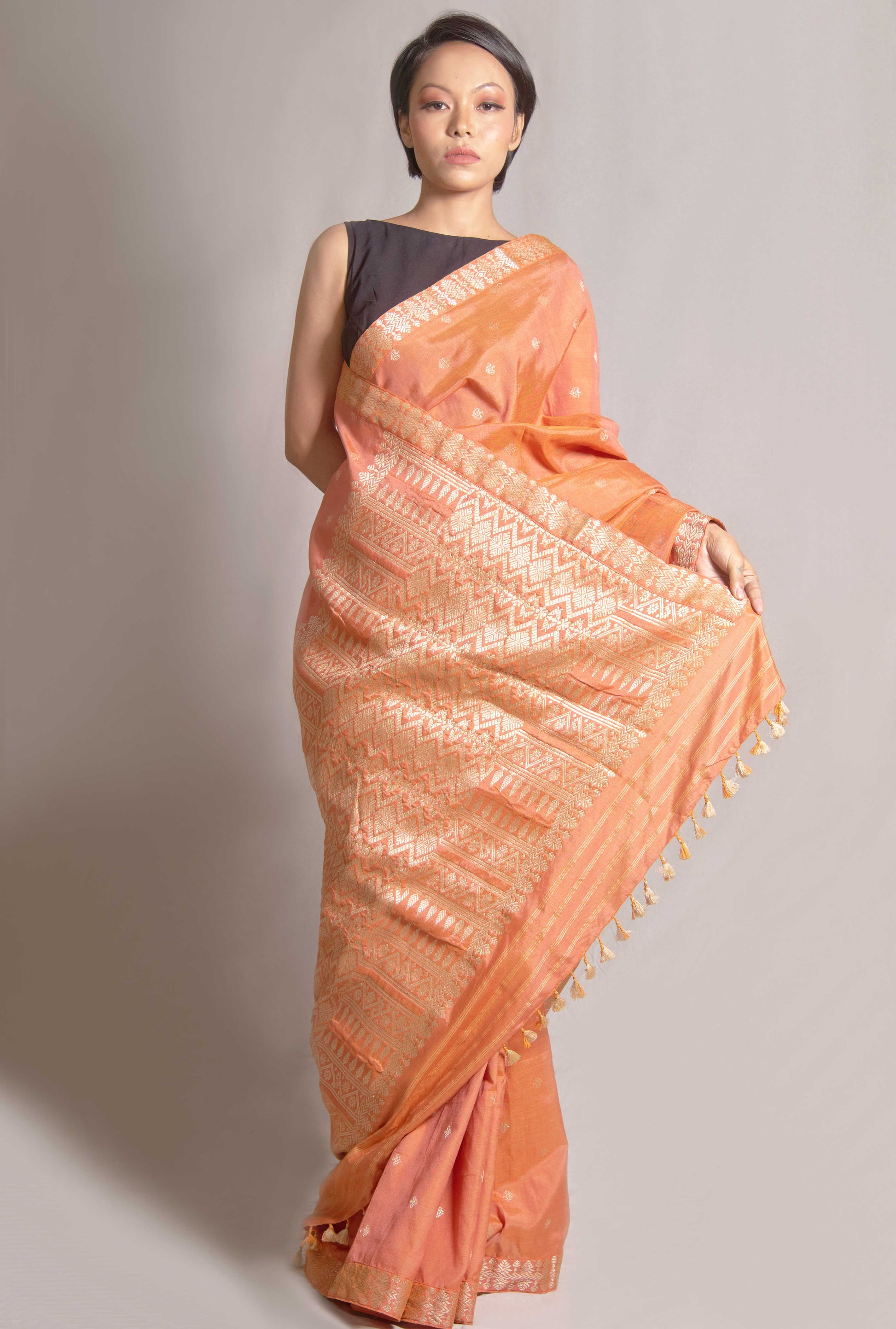 Crafted from a luxurious blend of Mulberry Silk and cotton, this Saree showcases intricate motifs in Tassar Silk. The perfect fusion of comfort and elegance, this Saree is ideal for any occasion. Elevate your wardrobe with the natural sheen and softness of this exquisite fabric.