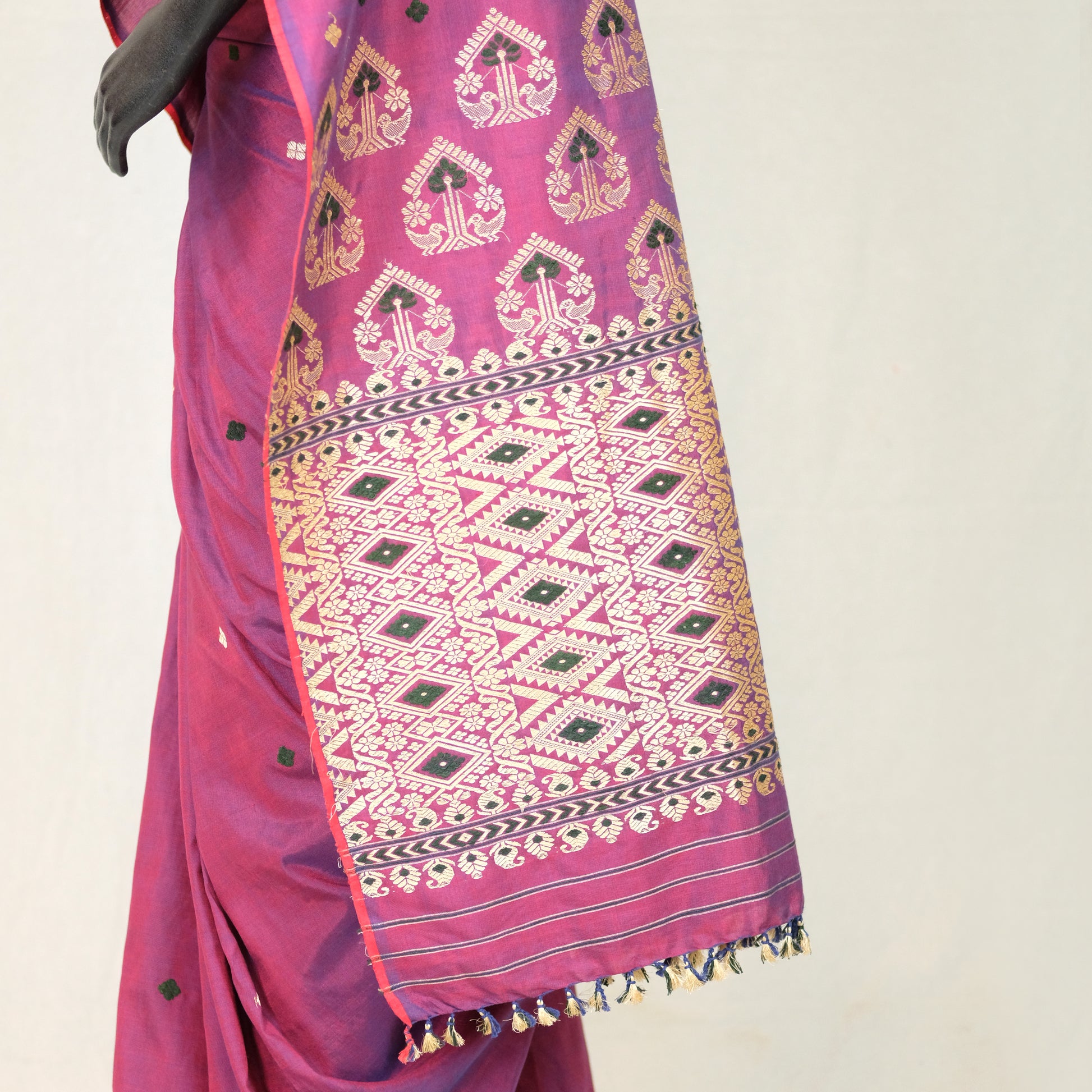 Elegant saree crafted from a luxurious blend of mulberry silk and cotton, offering a perfect balance of comfort and sophistication. The body drapes beautifully with a soft, fluid texture ideal for all-day wear.