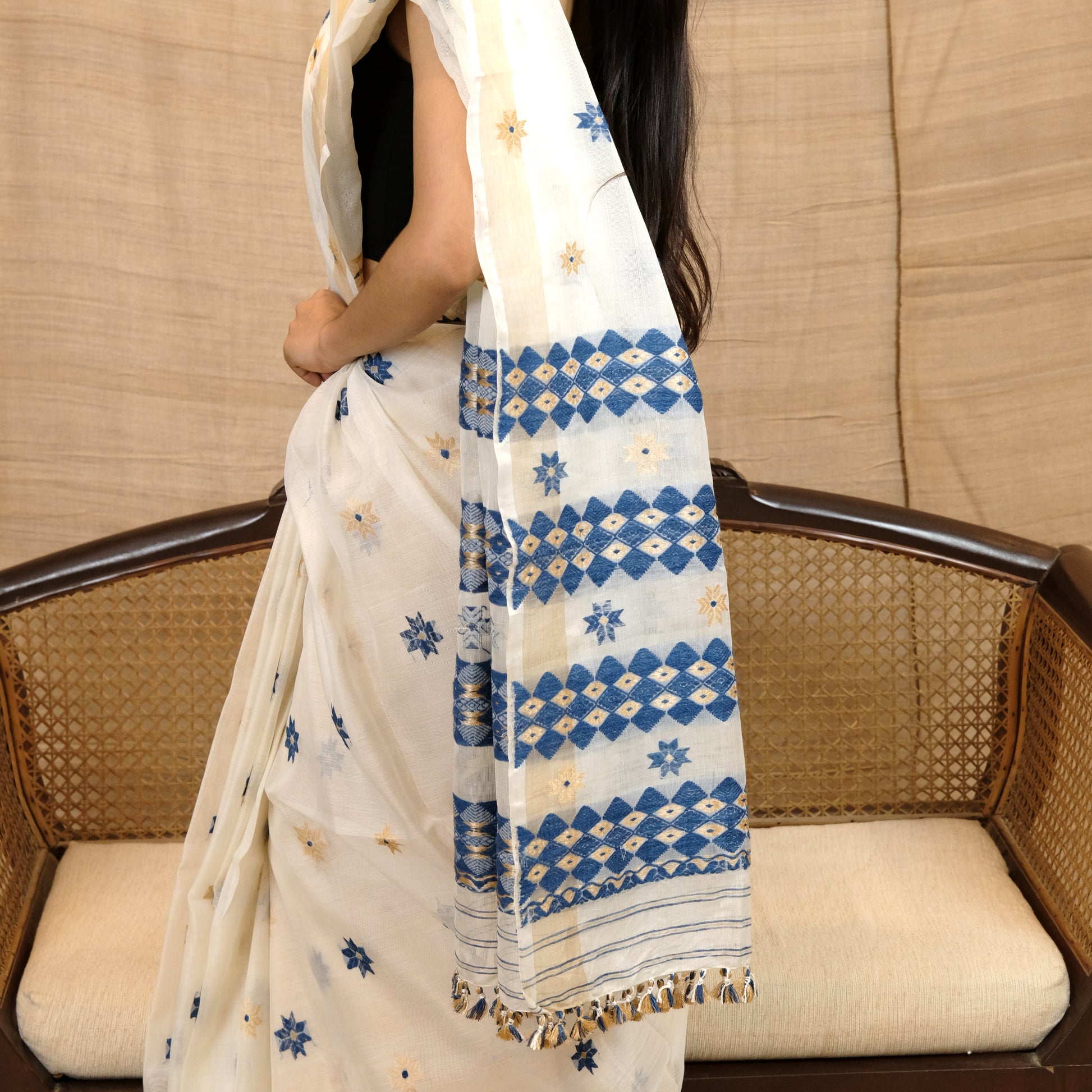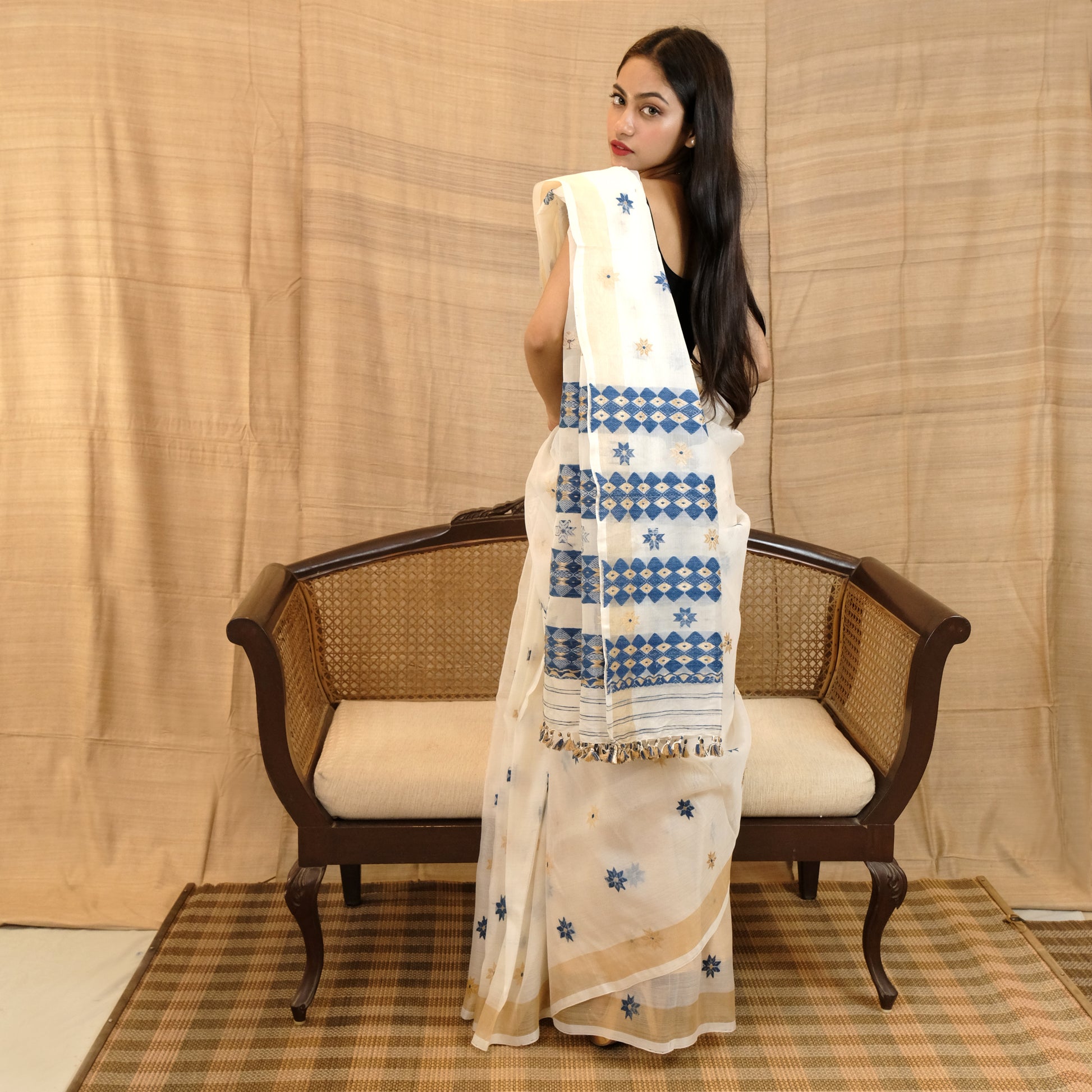 This saree artfully blends the textured elegance of Kesapat silk with the breathable comfort of cotton. The Kesapat silk provides a distinctive, tactile finish, while the cotton ensures lightweight wear and durability. Expertly crafted, this saree offers a refined drape and timeless appeal, suited for both formal occasions and everyday wear.