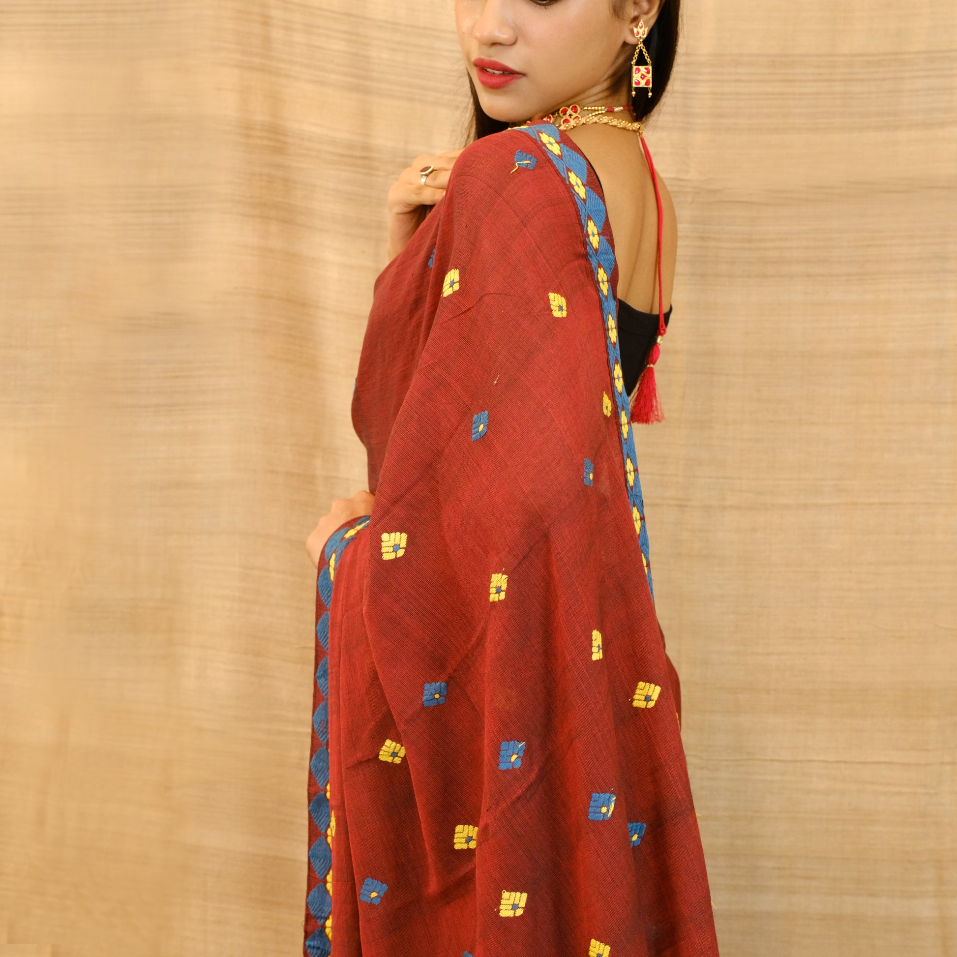 This cotton saree combines breathable fabric with a smooth drape, making it ideal for warm climates and comfortable daily wear. Crafted for durability and ease, it offers a timeless look that balances simplicity with elegance, suitable for both casual and formal occasions.
