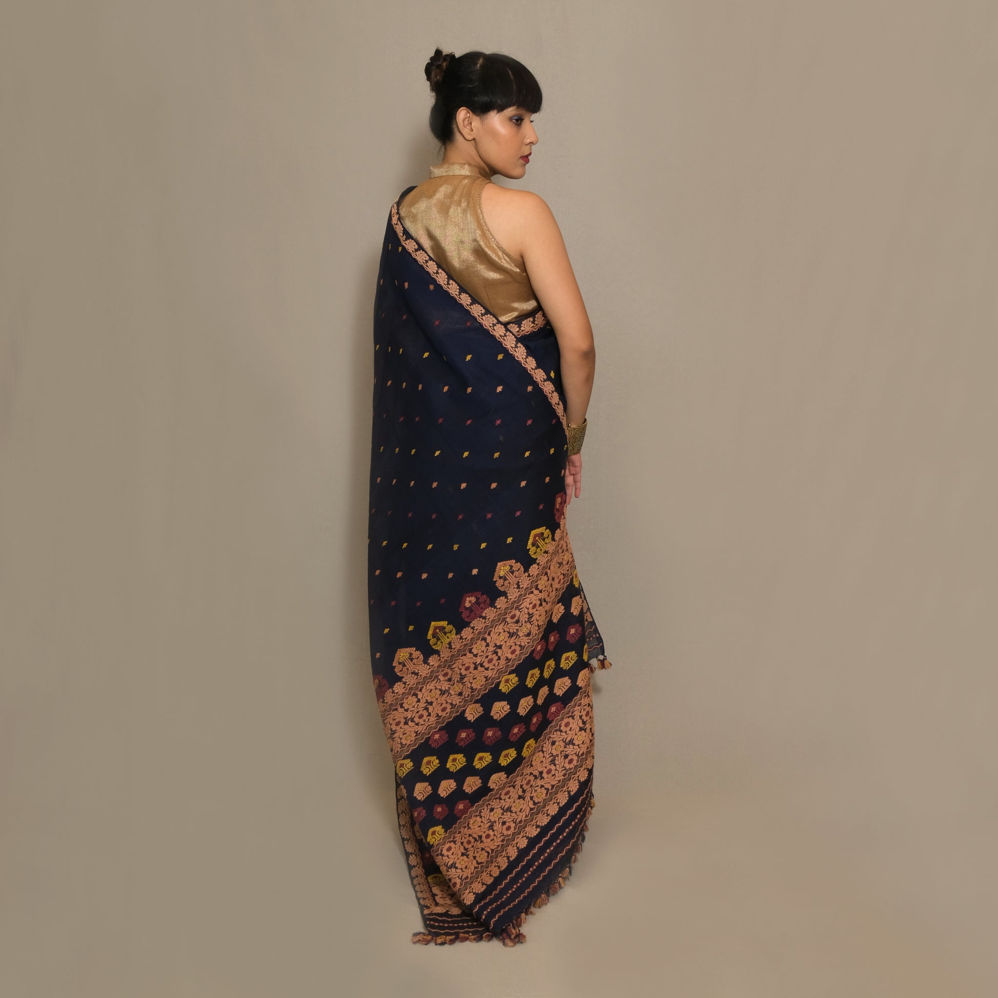 This saree combines luxurious Kesapat Mulberry silk with soft cotton, offering a harmonious blend of elegance and comfort. The Mulberry silk provides a rich sheen and smooth texture, while the cotton adds breathability and ease of wear. Expertly crafted, this saree drapes gracefully, making it an ideal choice for both special occasions and everyday sophistication.