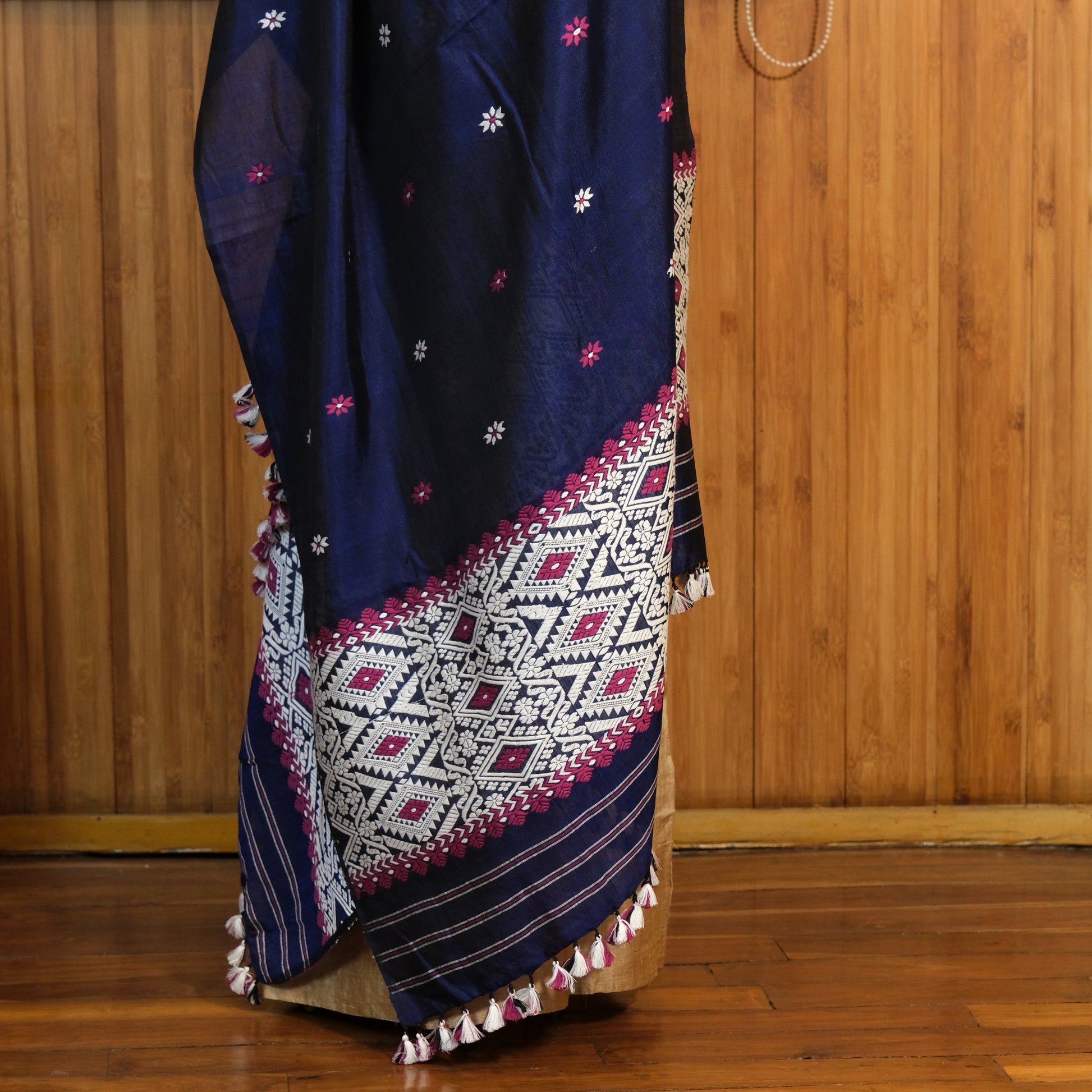 Experience the perfect balance of luxury and comfort with this Single Sador made from Mulberry silk (Paat) and cotton. The Mulberry silk imparts a natural luster and smooth texture, while cotton ensures breathability and resilience. This blend results in a refined fabric that drapes gracefully, ideal for sophisticated traditional attire that offers both elegance and practicality.