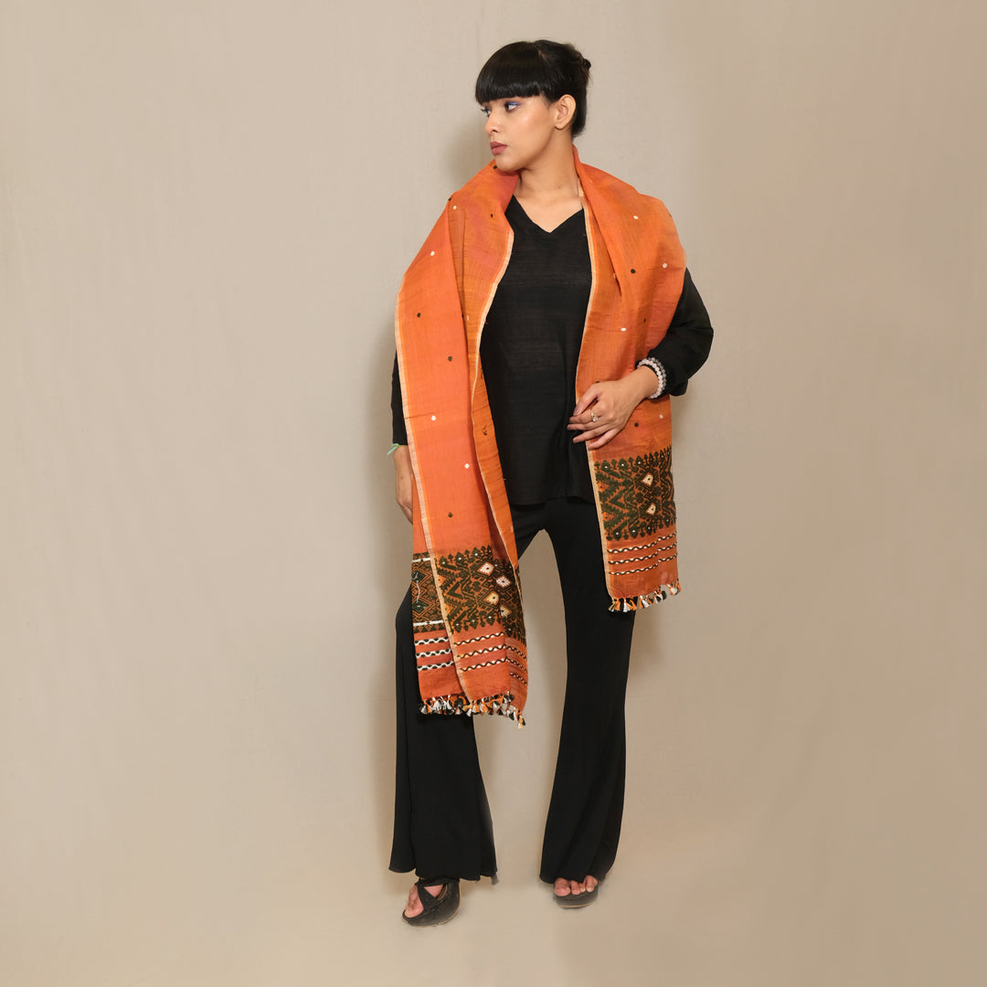 This exquisite stole combines the natural elegance of Kesapaat silk (Mulberry) with the breathable comfort of cotton. Expertly woven, it offers a luxurious texture and subtle sheen, making it a versatile accessory for both formal and casual occasions. The blend ensures durability while maintaining softness against the skin, reflecting refined craftsmanship and timeless style. Ideal for those who appreciate quality and sophistication in their wardrobe.